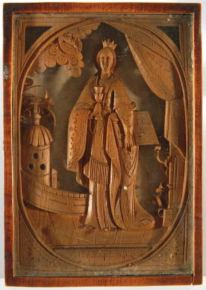 Описание: Резное изображение на фоне из светло-серой шёлковой ткани. В центре в рост в лёгком повороте влево представлена святая Варвара в короне и узорной мантии. В правой руке святой ― потир с крестом, левая рука придерживает раскрытую книгу с резной надписью: ТРОИЦУ ЧТУ. Вверху, слева, в облаках, изображён Святой Дух в виде голубя. Справа ― колонна, полускрытая завесой. Слева, за оградой, ― башня со шпилем и тремя круглыми окнами. По краям ― декор из узких спиралевидных стружек. Позём в виде дощатого пола. Изображения уплощённые, лик святой выполнен в более высоком рельефе. Композиция вписана в овал, заключённый в прямоугольную рамку с прорезными верхними углами. В нижней части овала ― резная надпись: С. М. ВАРВАРА. Икона в прямоугольном застеклённом киоте.