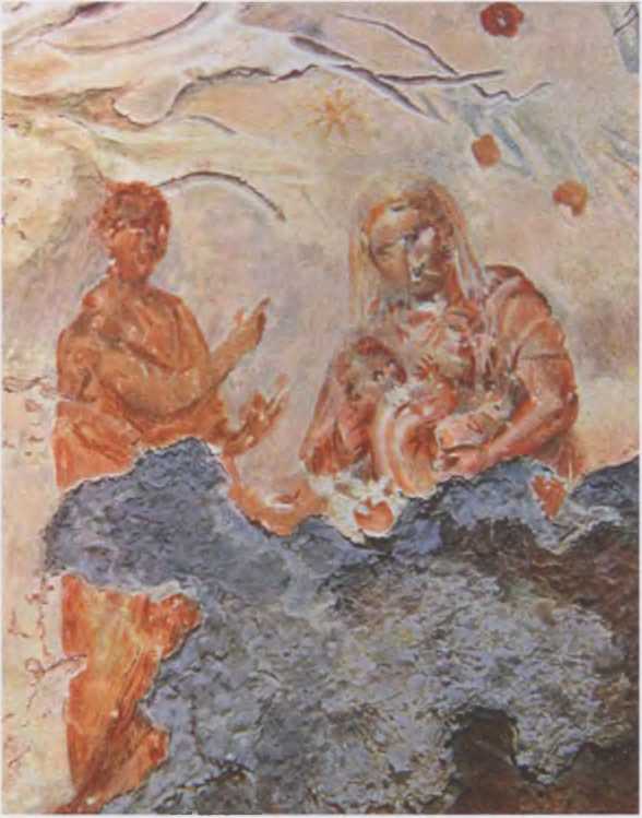 Иконография Рождества Христова, как и богослужение праздника, начала складываться еще в те времена, когда первые христиане для совершения своих обрядов вынуждены были скрываться от римских властей в катакомбах. Ко II веку относится фреска в катакомбах св. Присциллы в Риме. На ней изображена кормящая грудью женщина, рядом стоит мужчина, указывающий пальцем на звезду в небе. Именно этот указующий жест дал возможность исследователям интерпретировать сцену как относящуюся к Рождеству Христову. Кто этот мужчина, точно сказать невозможно. Может быть, это праведный Иосиф, а может, один из волхвов, пришедший поклониться новорожденному Христу? Некоторые исследователи предпочитают толковать его фигуру символически, как пророка Валаама, говорящего о рождественской звезде (Чис.24:17). Самые ранние из дошедших до нас образов с изображением собственно Рождества относятся к первой половине третьего столетия. В катакомбах св. Севастиана мы видим повитого пеленами Младенца, Который лежит на возвышении, рядом – Богоматерь с распущенными волосами в античном одеянии.