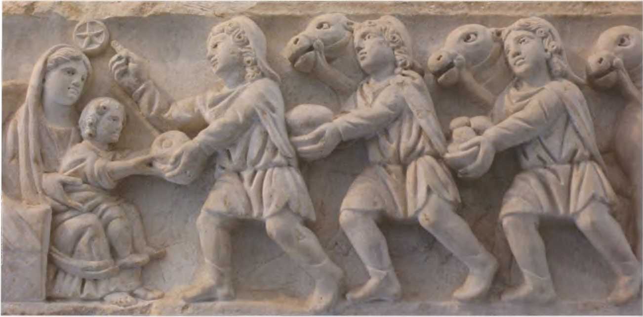 В самых ранних изображениях Рождества мы видим знакомство древних художников с Евангельским повествованием апостола Луки. Только с IV века в Римском искусстве появляются образы на сюжет Евангелия от Матфея: рядом с Богородицей и Младенцем начинают изображать пришедших с дарами волхвов. «Поклонение волхвов» изображают отдельно от поклонения пастухов. Особенно часто этот сюжет встречается на саркофагах. Образ пришедших к Христу волхвов был близок первым христианам. Они тоже были чужестранцами в Римской империи, язычниками, съехавшимися в Рим, и чаще всего не по своей воле, людьми чужими и для иудеев, и для римлян. Поэтому первые христиане невольно сравнивали себя с волхвами, чужестранцам-язычниками, совершившими долгий путь, чтобы воздать царские и божеские почести новорожденному Богомладенцу и Его Матери. В первые века для христиан Рима часто важнее было показать не само Рождество Спасителя, а вселенское значение этого события, его одинаковую важность для всех народов.