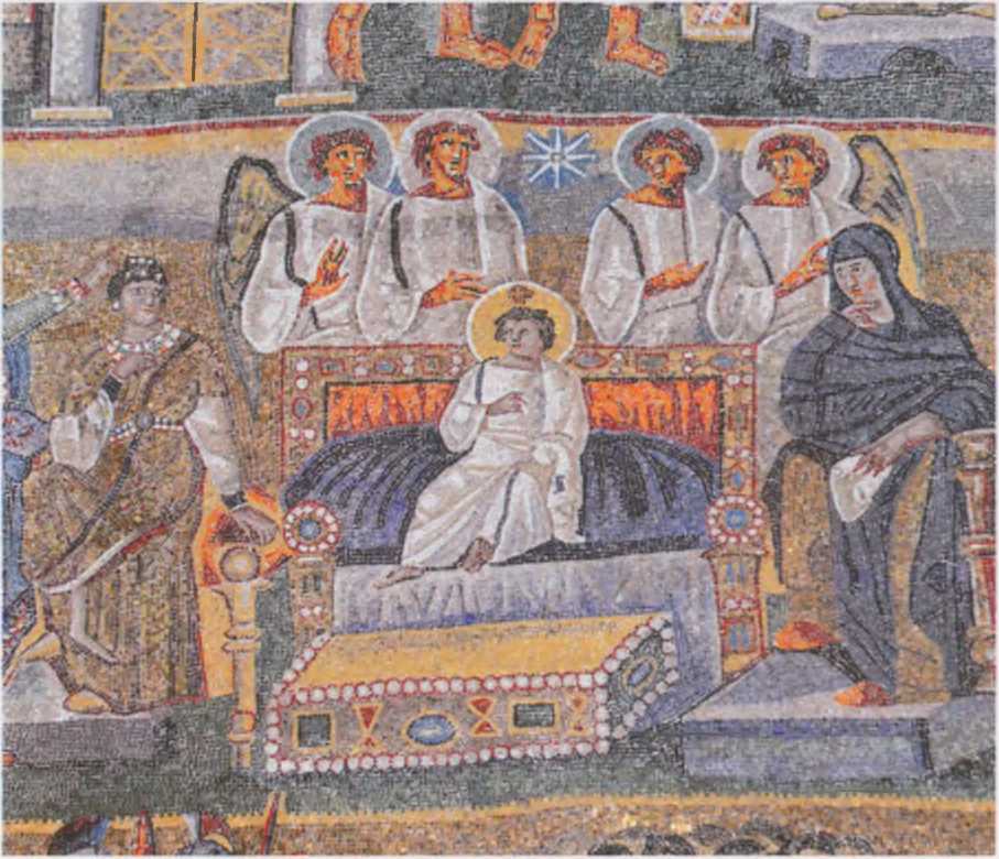Сцена царственного приема Иисусом Христом и Его Матерью пришедших к Ним волхвов изображена в мозаиках церкви Санта Мария Маджоре (V век), одной из четырех главных базилик Рима, в которой хранятся ясли Спасителя. Богоматерь изображена здесь не в обычном Своем темном мафории, а в великолепном золотом платье с белыми рукавами, сидящей по правую руку от Своего царственного Сына. То, что это Богородица можно понять, только сравнивая изображение с мозаикой в верхнем регистре, где Дева Мария представлена в сцене Благовещения в точно таком же золотом наряде. Новорожденный Христос восседает по центру на роскошном троне, который очевидно Ему велик и рассчитан на взрослого человека. По левую руку от Него – еще одна женщина, облаченная в одеяние, похожее на традиционные одежды Богородицы. Специалисты полагают, что эта женщина символизирует Синагогу, склоняющуюся перед царственным величием Новой Церкви, образ которой воплощают Божия Матерь и Ее Сын. Вверху, над головой Христа, горит Рождественская звезда. Волхвы, одетые в соответствующие одежды языческих жрецов, стоят с двух сторон от престола; тот, что справа от него, указывает на звезду. Созданная в Санта-Мария Маджоре симметричная иконография поклонения волхвов не прижилась, и в дальнейшем изображение сюжета вернулось к иконографической схеме, сложившейся еще в катакомбный период: Богородица с Младенцем восседают на престоле справа или слева, а волхвы друг за другом несут Им дары. Одно из таких ранних изображений – мозаика шестого века в базилике Сан Аполлинаре Нуово в Равенне.
