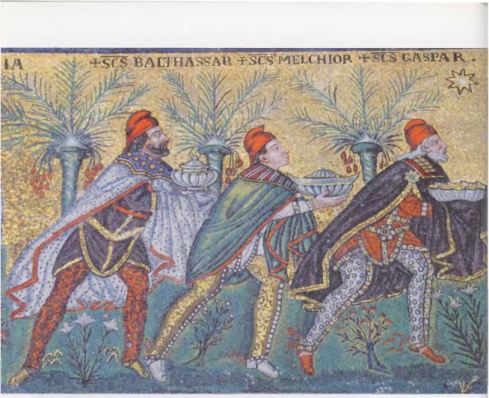 Здесь мы снова видим волхвов, которые, широко шагая и кланяясь, устремляются к Новорожденному Спасителю. Гости с Востока одеты в пестрые одежды и красные колпачки-пилосы. Похожие одеяния уже встречались на рельефах катакомбных саркофагов и в церкви Санта Мария Маджоре.