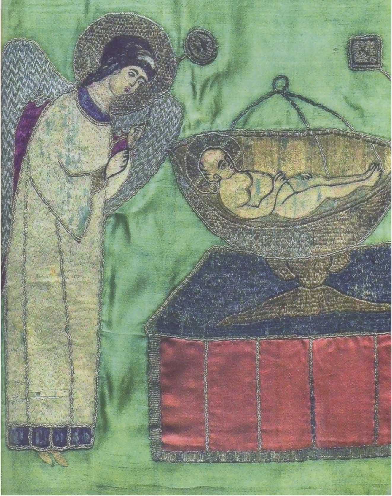 Похожая иконография на иконе из Русского музея. Здесь Младенец Христос отмечен необычным цветом: Он лежит в зеленой колыбели, по традиции похожей на гроб, и повит в зеленые же пелены. Иконописец, конечно, изобразил пелены не белыми, а зелеными не случайно. В Евангелии, в разговоре с учениками, Христос однажды сравнивает себя с пшеничным зерном: «Иисус же сказал им в ответ: пришел час прославиться Сыну Человеческому. Истинно, истинно говорю вам: если пшеничное зерно, падши в землю, не умрет, то останется одно; а если умрет, то принесет много плода. Любящий душу свою погубит ее; а ненавидящий душу свою в мире сем сохранит ее в жизнь вечную» (Ин.12:23–25). Метафорический образ зерна, которое должно умереть, чтобы принести плод, и запечатлел художник в этой иконе с помощью цвета.
