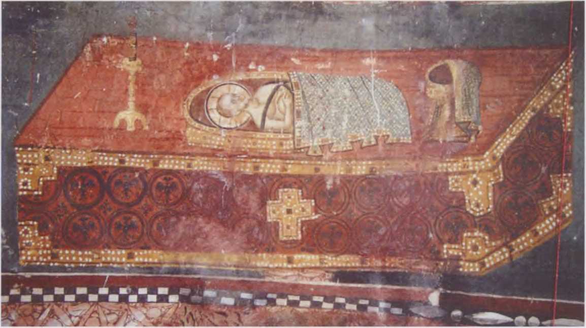 В VI веке происходит важное событие – перестройка базилики Рождества над Вифлеемской пещерой. Первый храм Рождества, построенный при императоре Константине Великом в IV веке, по свидетельству древних христианских историков, – Евсевия Кесарийского и Кирилла Скифопольского, – строился не для служения литургии, а для того, чтобы каждый верующий мог увидеть место рождения Иисуса Христа. Поэтому алтаря и престола в нем не было. Первый храм сгорел – при археологических раскопках обнаружены пепел и обугленные останки этой постройки. Новый храм был построен при императоре Юстиниане I (483–565, император с 525 г.), в VI веке. В нем над пещерой Рождества возводится первый алтарь и престол для совершения Литургии. Именно тогда на иконах ясли Христа начинают изображаться в виде сложенного из каменных блоков прямоугольного одра, похожего на престол из Рождественского храма Юстиниана.