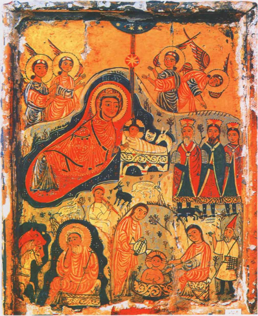 На сирийской иконе VII в., сохранившейся в монастыре св. Екатерины на Синае6, изображены уже все привычные иконографические детали, которые будут повторяться в иконах Рождества Христова: земля, горой поднимающаяся вверх, над которой стоят ангелы и указывают на звезду и волхвов. Верхняя часть горы разрезана пещерой. В ней на красном ложе лежит Богородица. Рядом – украшенный арками и резьбой одр престол с повитым пеленами Младенцем Христом. По сравнению с более древними изображениями, здесь Спаситель изображен очень маленьким. Этим подчеркивается степень умаления, самоуничижения (по-гречески – кенозис) Бога, воплотившегося в ребенка. И необычная деталь: вол и осел не просто уткнули свои морды в ясли, они лижут пелены Божественного Младенца! Этот несколько наивный образ раскрывает литургический смысл события. Невинные животные стремятся первыми стать причастными Христу, в то время как люди еще до конца не поняли, зачем воплотился на земле Спаситель. Это словно наглядная иллюстрация пророчества Исайи о воле и осле, которые знают Господина своего, в то время как люди не разумеют. И действительно, один из пастухов играет на дудочке, другой наблюдает за женщинами, купающими Младенца, Иосиф печально смотрит на лошадей, видимо, принадлежащих волхвам, а те чередой несут Младенцу свои дары. И только Богородица, фигура Которой напоминает какую-то райскую птицу, исполнена радости и спокойствия и вместе с животными прикасается к пеленам Своего Сына. Строгий лик Христа с крестчатым нимбом над детскими пеленками заставляет вспомнить о погребальных пеленах, которыми был повит Господь в гробу. Мистический характер всего происходящего подчеркивает спускающаяся в широком луче из небесного полукруга звезда. Теперь она всегда будет изображаться именно так.