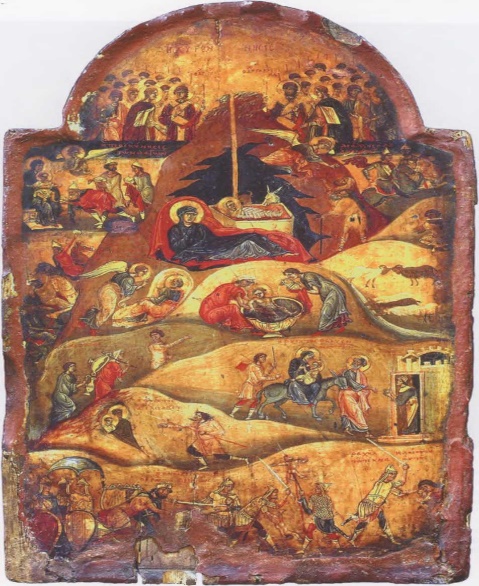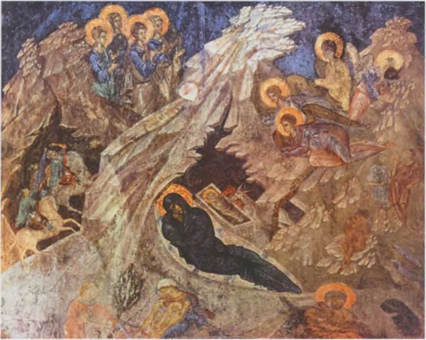 В XIV–XV веках Византийская империя подходит к эпохе своего заката. В тяжелый для нее век, когда она рушилась под ударами турецких завоеваний, тысячи эмигрантов (монахи, художники, священнослужители, ремесленники) устремились на Русь. Многие из них поселились здесь навсегда и восприняли местные культурные традиции. Одновременно, они обогатили язык русской иконописи новыми сюжетами и иконографиями. От этой эпохи в самой Греции сохранился уникальный фресковый ансамбль в городе Мистра. В XIV–XV веках Мистра была столицей одного из последних оплотов византийской культуры, Морейского деспотата. В церквях Мистры, посвященных Богородице, Перивлепты (в переводе с греческого – «Прекрасная») и Пантанассы («Всецарица»), сохранились знаменитые поздневизантийские образы Рождества Христова. В них впервые мы видим иконографию, точно следующую за словами кондака праздника и выстраивающуюся вокруг изображенной строго по центру пещеры Рождества.