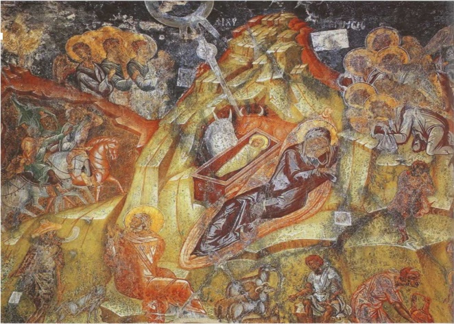 Фрески Мистры отличаются необыкновенной динамикой образов. Это настоящее живописное ликование: радость возрождения умиравшей без Бога природы; радость встречи земного и небесного, людей и ангелов. Горки написаны столь экспрессивно, что, кажется, они только что взметнулись к небу. Особенно выразителен центральный отрог скалы, расщепляющий свои уступы, чтобы принести рождающемуся Богу «вертеп». «Ликуй, вселенная, – поется в рождественской службе, – услышавши, прослави со Ангелы и пастырьми хотящаго явитися Отроча Младо, Превечнаго Бога».