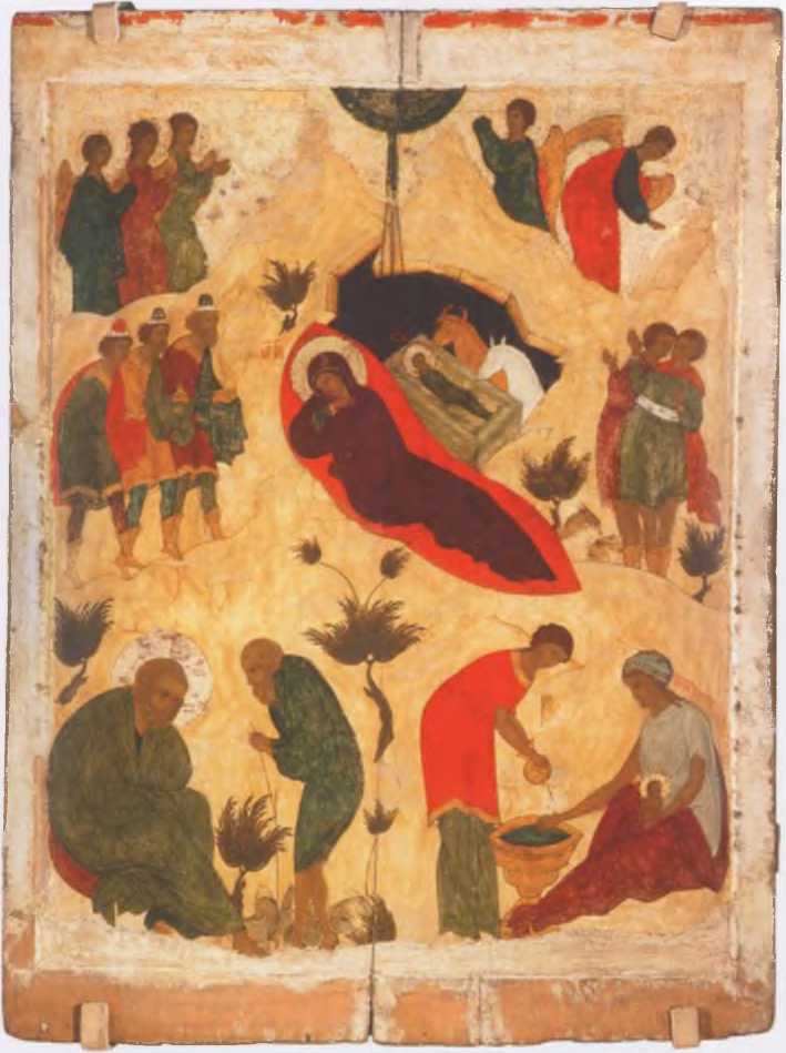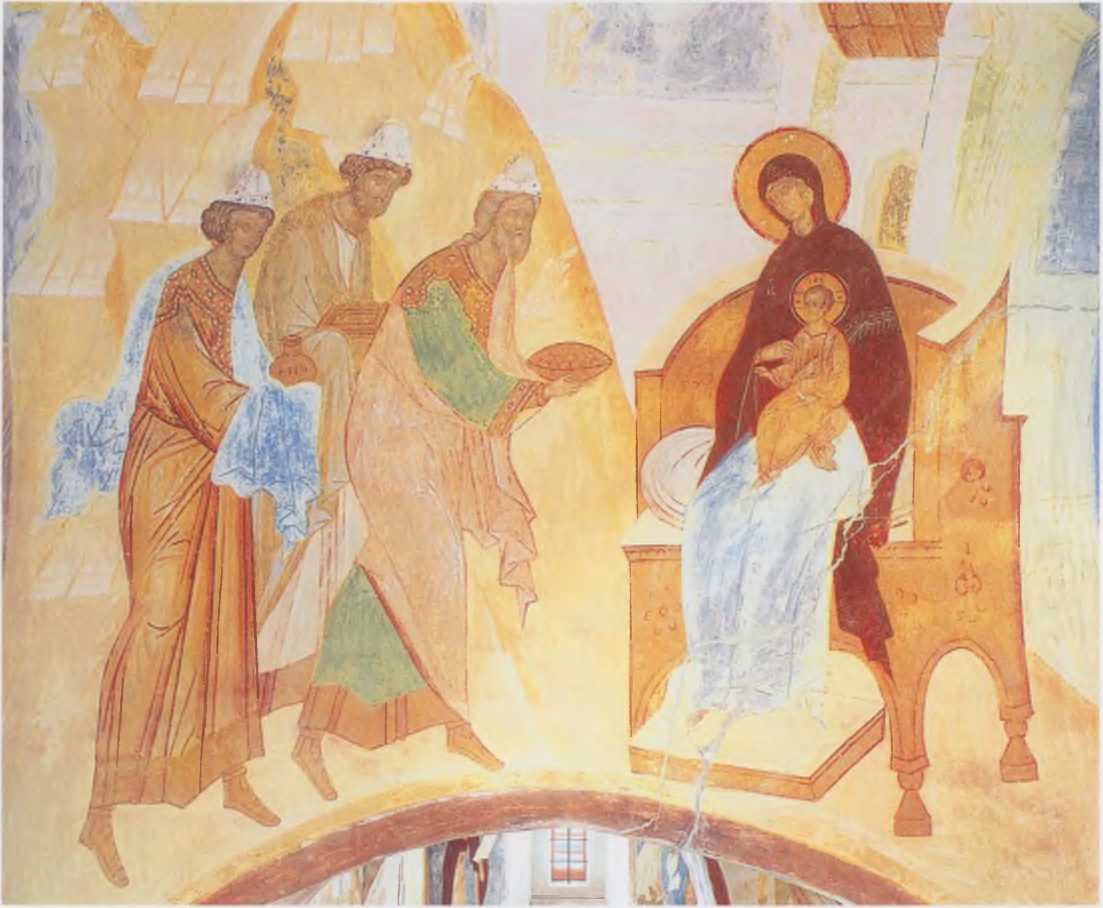 В русских образах, посвященных Рождеству, раскрывается особенность почитания Богородицы на Руси. В греческих иконах между Девой Марией и остальными персонажами художники старались сохранить реалистические взаимоотношения. В русских иконах Божия Матерь всегда – Царица Небесная, в любой момент Своей земной жизни. И Ее отделяет от остальных персонажей не столько размер, сколько весь композиционный строй, художественная интонация изображений. Так, на фресках Дионисия в Ферапонтовом монастыре, в сцене поклонения волхвов, маги отделены от Богородицы краем горы. Они словно движутся вместе с этой горой, не в силах выйти за ее рамки и увидеть сияющий чертог, возвышающийся за троном, на котором сидит Божия Матерь с Младенцем. Это удивительно глубокая живописная метафора, показывающая, насколько ограничено человеческое восприятие: мы видим только то, что можем, что ожидаем увидеть. Вот и волхвы полагают, что пришли в пещеру, и не ведают, что оказались на небе.