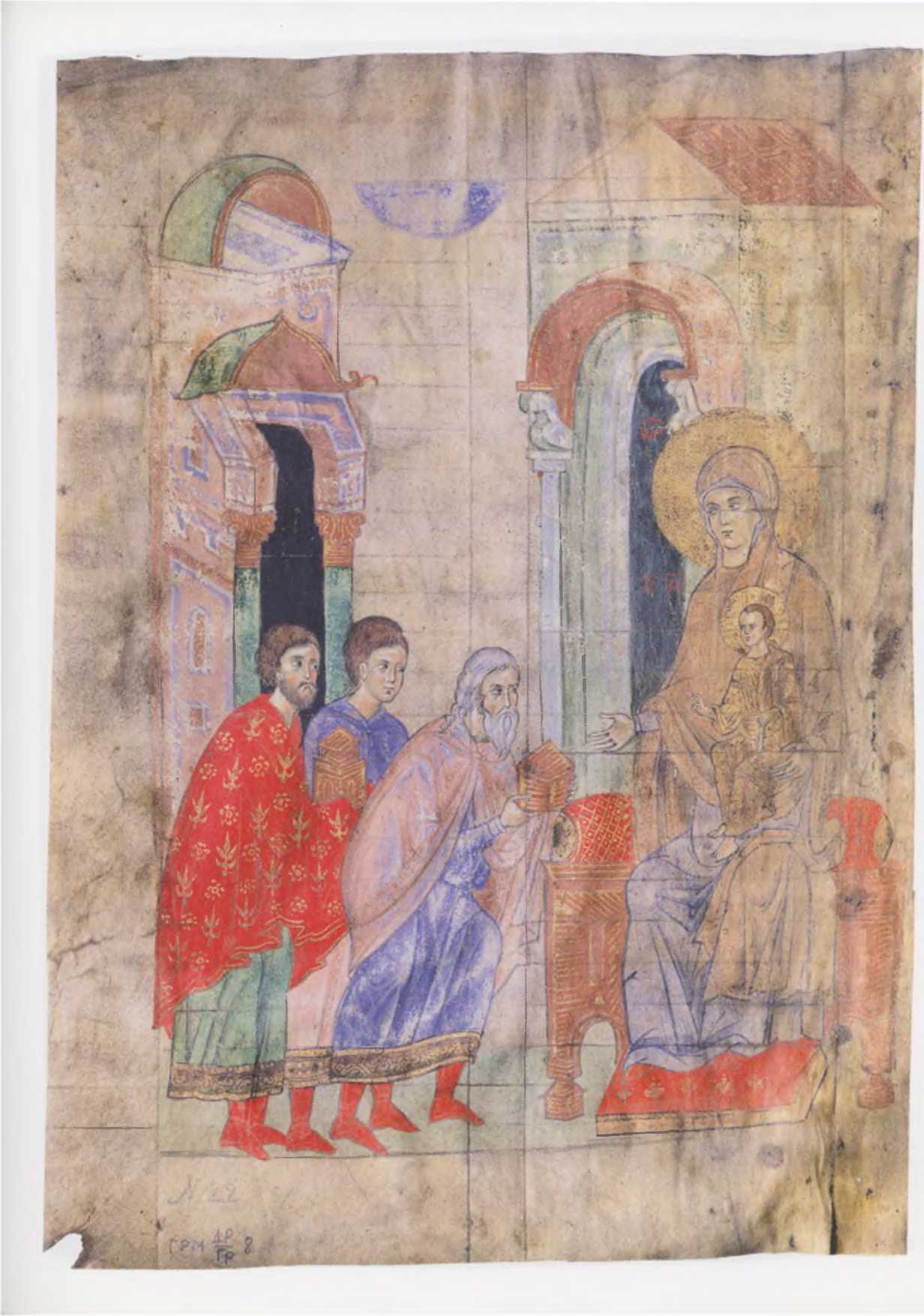 Также недосягаемо возвышенно постарался изобразить Богородицу в сцене поклонения волхвов и автор знаменитой миниатюры Сийского Евангелия Апракос (1340 год). Волхвы здесь напоминают скорее не дарителей, а просителей, молитвенно обращающихся к Небесной Царице, – так часто изображаются на иконах предстоящие Богородице святые. Царица Небесная милостиво протягивает им руку, словно в знак того, что их мольбы услышаны, а Царственный Младенец у Нее на руках благословляет их.