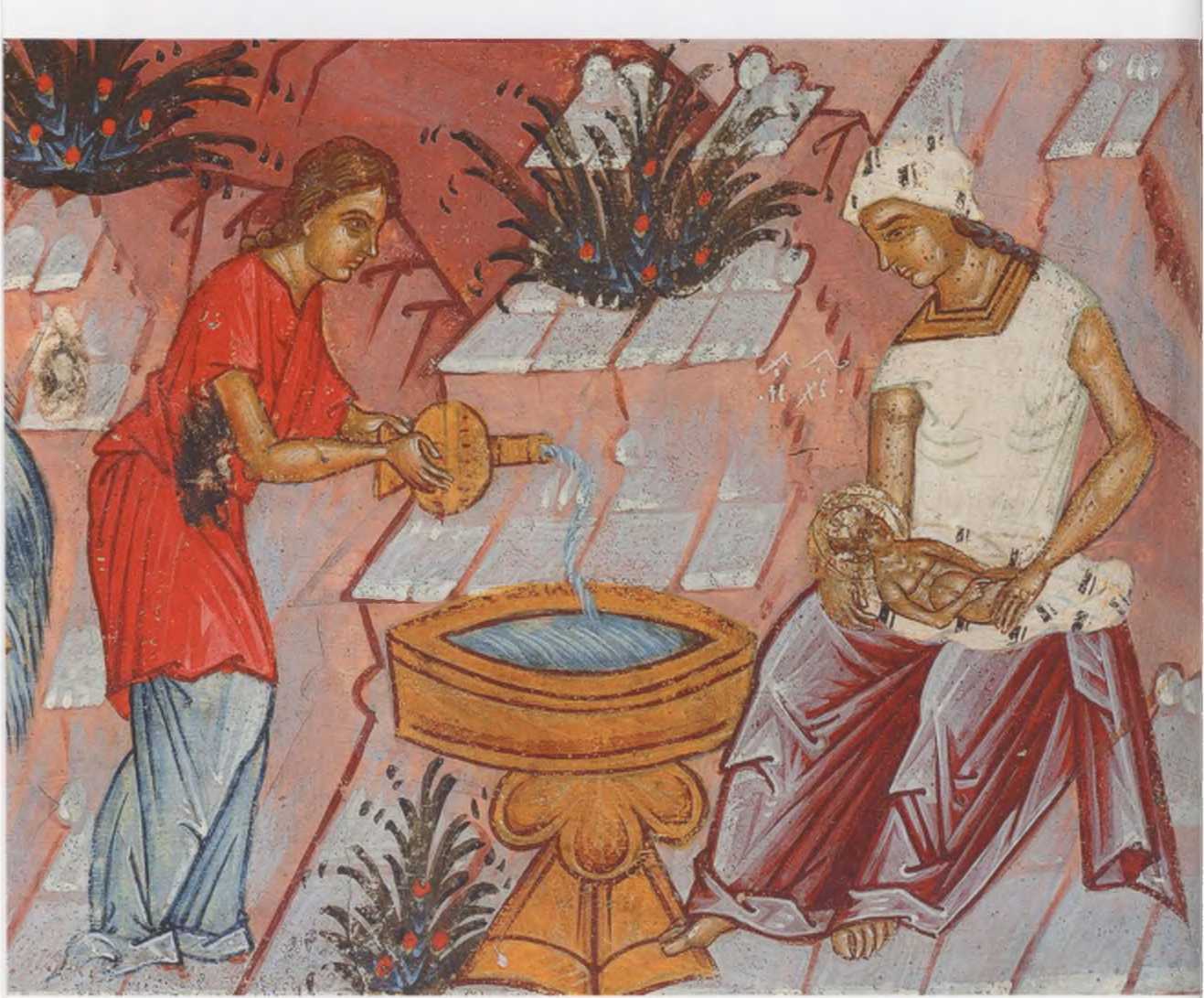 В этой иконе мы видим новую иконографическую схему: к изображению добавляются фигуры двух повитух, омывающих Младенца в купели. Причем купель очень странная по форме, напоминающая кубок или чашу. Конечно, ванночки, в которых купали младенцев, в древности были другими, не похожими на современные, но вряд ли они имели столь сложную форму. Поэтому не удивительно, что многие исследователи иконографии видят в этой купели Евхаристический символ. Ведь из похожих по форме чаш на литургии верующим подаются Святые Дары – Тело и Кровь Христовы. Похожее (но, конечно, не равнозначное) изображение Христа в чаше мы видели в композициях «Се Агнец».