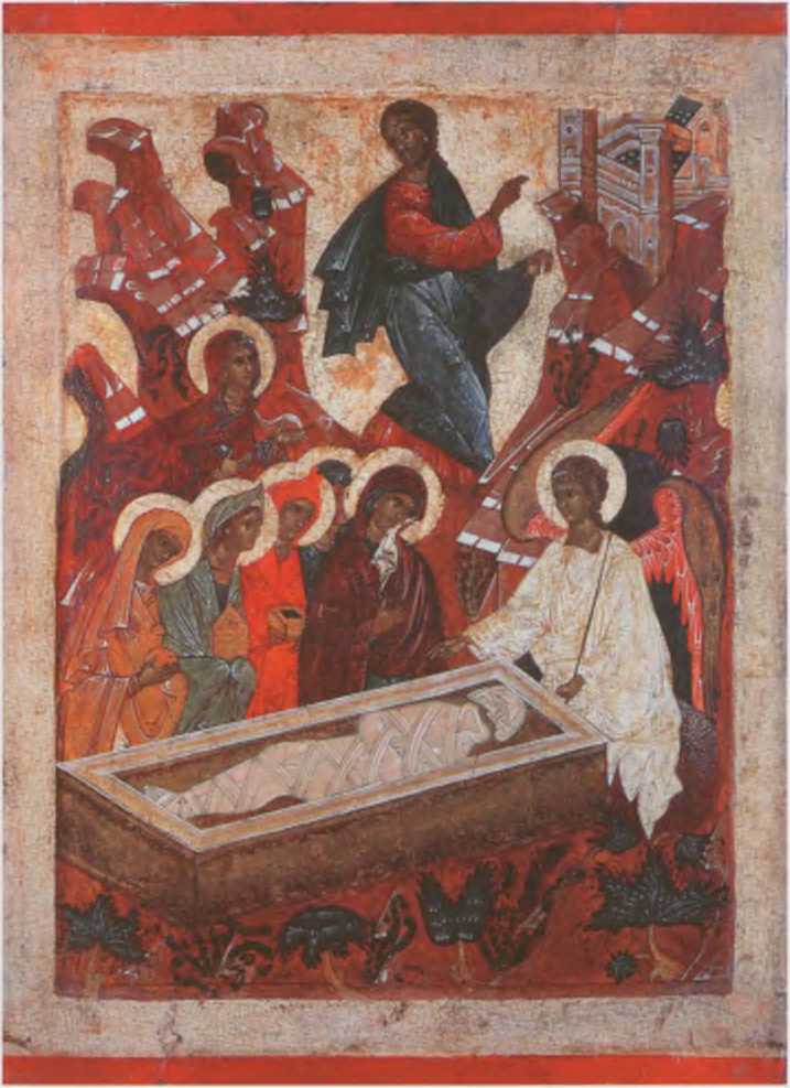К Рождественской пещере, как к мистическому центру, волнами сходятся все остальные сцены, изображенные на иконе. По сторонам – история волхвов: их приезд, поклонение Младенцу Христу и отъезд. При этом волхвы, в соответствии со сложившейся традицией, показаны трех разных возрастов. Справа Младенец Христос благословляет волхвов двумя руками, подобно архиерею в храме. Одежды волхвов уже условно «восточные»: культ Митры в XII веке не актуален. Справа вверху – «Благовестие пастухам». С другой стороны, ниже по диагонали, – «Сон Иосифа» – чудесное событие, предшествовавшее Рождеству, которое упоминается в Рождественской службе. Иосиф усомнился в чистоте Девы Марии, узнав о том, что Она зачала. Его сомнения в непорочном зачатии развевает Ангел (запомним эту деталь), явившийся во сне. Ниже по центральной оси, под Богоматерью и пещерой, размещена сцена Омовения Младенца, представленная в соответствии со сложившейся литургической традицией. Ее дополняет редчайшая для Византии и иногда встречающаяся в поздней русской иконописи сцена «Несение купели», изображающей Саломию и Зелому, которым указывает путь юноша, видимо, сын Иосифа. В нижних регистрах – события, связанные с преследованиями Ирода. Слева праведная Елисавета, прячущаяся с младенцем Иоанном в чудесно расступившейся скале, рядом – «Бегство в Египет» Святого Семейства. Внизу – сцена жестокого «Избиения младенцев» с фигурой Ирода на троне, отдающего приказы. Приняв Крещение в 988 году из Византии, Русь приобщается к византийской культуре в эпоху ее расцвета. Иконография Рождества Христова приходит сюда уже в своем завершенном виде. К сожалению, русские живописные произведения на эту тему из раннего периода до нас дошли только в монументальных ансамблях плохой сохранности. Но и из них видно, что иконописцы не только следовали византийской иконографической схеме, но и дополняли ее различными подробностями, композиционно переосмысляли. На Руси рождественский цикл уже в XI–XII веках почти всегда представал в расширенном варианте. Конные изображения восточных мудрецов присутствуют в монументальной живописи собора Антониева монастыря в Новгороде, собора Мирожского монастыря в Пскове, Борисоглебской церкви в Кидекше и Кирилловской церкви в Киеве (все – XII века), в то время как в греческих мозаиках и фресках этого времени такие примеры единичны