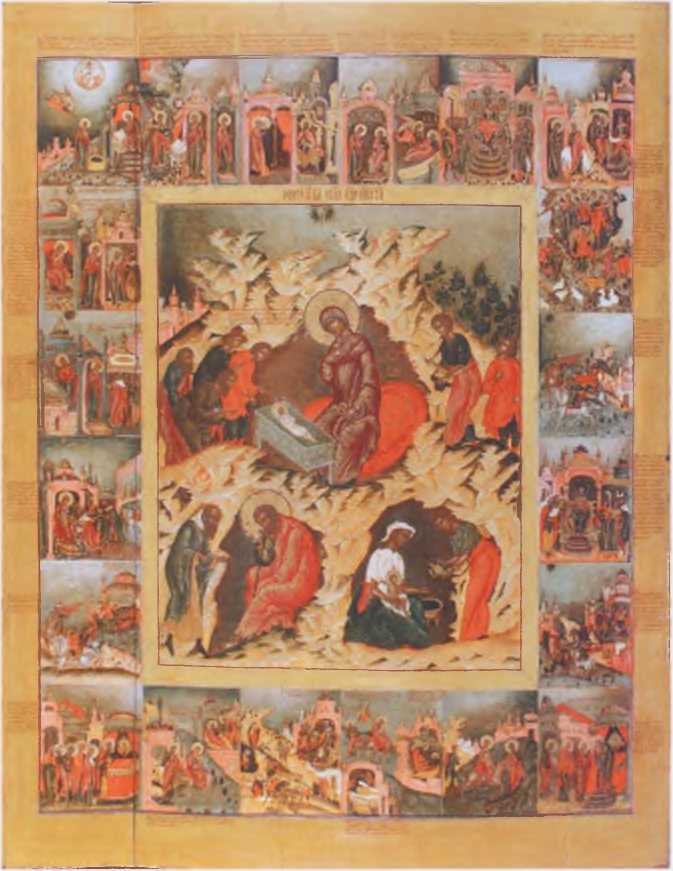 Царские изографы XVII века возвращают в икону большой образ, но он сильно меняется к этому времени. Замечательным памятником эпохи является икона из музея Андрея Рублева «Рождество Христово с двадцатью клеймами». Сцена Рождества освобождается от подробностей, которые иконописец все переносит в клейма. Но освобожденное пространство уже строится по новому принципу. Горки продолжают играть роль объединяющего сюжеты орнамента. И все изображение скорее похоже на Рождественскую мистерию, вертепный театр, представленный зрителю, за кулисами которого с одной стороны мы видим башни, напоминающие Московский Кремль, а с другой – зеленеющий сад. Удивительно, но на иконе нет ангелов, волхвы стоят вперемежку с пастухами, и звезда похожа на игрушку. Богородица, волхвы, пастухи не поклоняются Воплощенному Богу, как это было на древних иконах, а, скорее, умиляются Младенцу. Особенно выразителен жест руки Богородицы, прижатой к груди, и Ее нежное улыбающееся лицо. Вокруг в клеймах очень подробно рассказывается вся Рождественская история: от Благовещения Пресвятой Богородицы до Сретения Господня. Действие происходит на фоне розовых дворцов с золотыми башенками и зеленых холмов, где ангелы летают на небесах как диковинные птицы. Каждое клеймо сопровождается пространным рассказом. Это словно Рождественская сказка, душеполезное чтение с добрым назидательным концом.