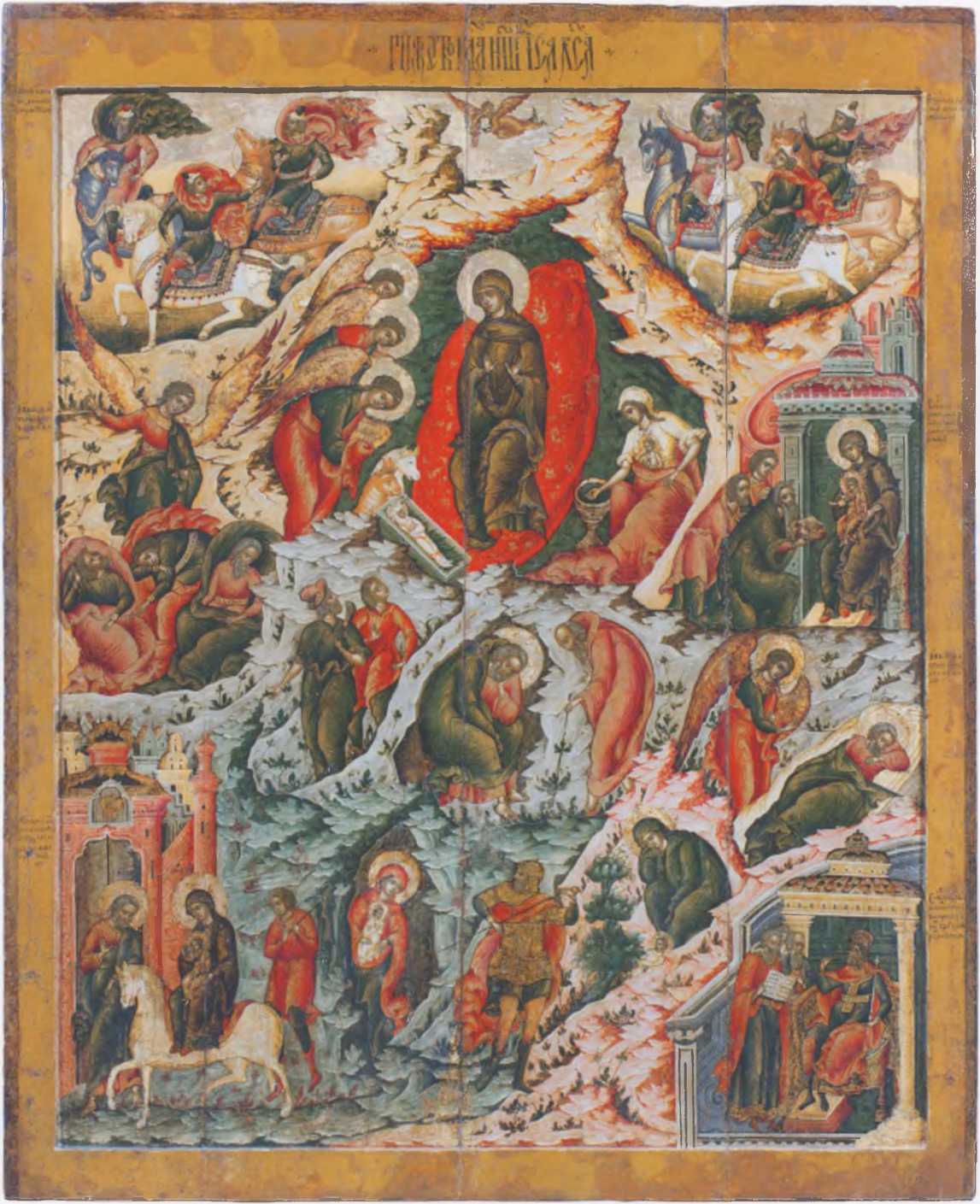 С XVI века иконы Рождества Христова обретают все большую многословность. Все чаще художники обращаются к расширенному изводу, в котором, помимо традиционных изображений, появляются «Путешествие в Вифлеем», «Путешествие волхвов», «Сон волхвов», «Возвращение волхвов», «Ирод отдает приказ об избиении младенцев», «Избиение младенцев», «Спасение Елизаветы и Иоанна Предтечи в горе», «Спасение младенца Нафанаила», «Бегство в Египет». Стремление к подробному иллюстрированию всех деталей Евангельского текста, с добавлением различных апокрифических легенд, к XVII веку превращает иконы Рождества в подобие панорам или орнаментальных панно. Например, на иконе из Ярославля, хранящейся сейчас в музее Андрея Рублева в Москве, мы видим, как горки превращаются в некий орнамент, который соединяет между собой различные сюжеты. Евангельские сцены на этой иконе – словно вышитые цветы на кружевном полотне. В них много увлекательных подробностей, декоративности, за которыми теряется литургический образ события. Художественный язык русской иконы меняется настолько радикально, что мы едва распознаем в этом пестром узоре знакомые образы.