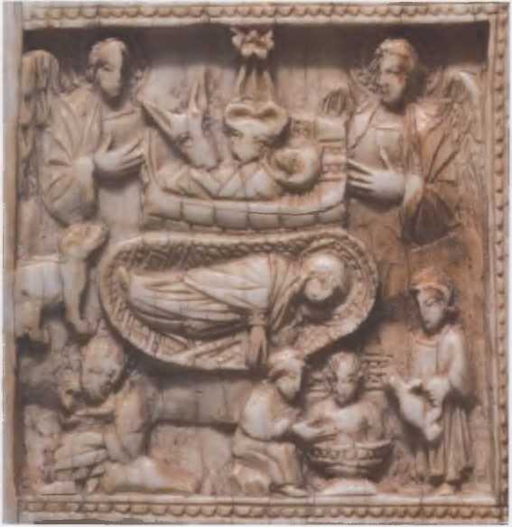 История изображения Рождества Христова в прикладном искусстве неразрывно связана со всей историей иконописи в целом. Сначала оно изображалось на саркофагах, потом мы видим его как одно из клейм многочастных икон с двунадесятыми праздниками (двенадцать главных праздников). Интересно изображение Рождества на одной из византийских костяных пластин, хранящихся сейчас в Эрмитаже. На ней символический образ земли, которая стала небом, создан за счет изображения Богородицы и яслей. Они представлены в таком ракурсе, будто земля вертикально стоит перед нами, и мы смотрим на нее сверху. Волхвов нет. Свет от звезды падает на животных, прижавших морды к пеленам Младенца Христа.