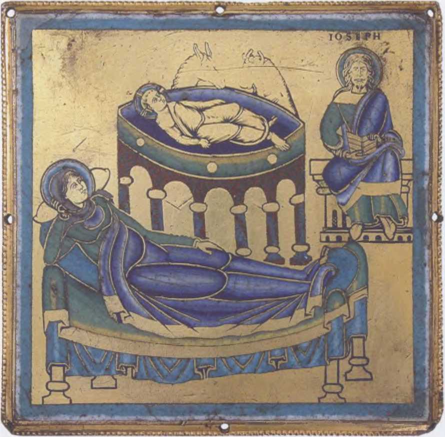 Очень интересна своей иконографией небольшая медная икона, сделанная во Фландрии в XI в. в технике выемчатой эмали. Сюжет Рождества Христова здесь сокращен до минимума. Оставлены только три фигуры – Богородица, Младенец Христос и Иосиф Обручник. В центре всей композиции – ложе, на котором покоится Младенец Иисус. Это жертвенный престол, выполненный в виде арочной ротонды. Интересно, что форма престола повторяет архитектуру кувуклия (часовни) храма Гроба Господня в Иерусалиме. Построенный прямо над местом погребения Христа кувуклий со времен императора Константина всегда возобновлялся в виде круглой сени над Гробницей Христа. Таким образом, на иконе из Фландрии только что рожденный Спаситель положен уже не в символический, а в настоящий, реально существующий Гроб, место паломничества. Литургический, жертвенный смысл Рождества Христова у средневековых западных авторов обретает вполне реалистические черты.