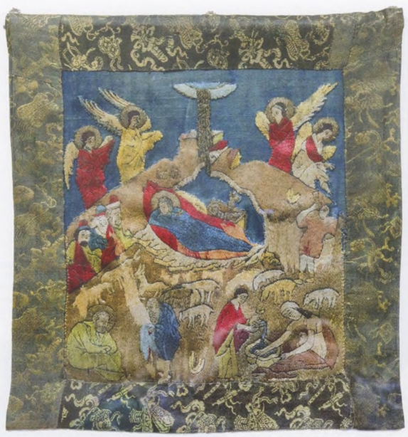 С первой половины XV века сохранилась, не утратив удивительной яркости цвета, пелена «Рождество Христово» из Троице-Сергиевой Лавры. Глядя на нее, невольно вспоминаешь, что вышивку с древности называли «живописью иглой». Древний фон иконы не сохранился, но плотный, вышитый стежком «в раскол» рисунок из шелка аккуратно пришит к новому синему материалу. Со всех сторон икона оторочена золотным атласом – дорогой привозной тканью, создающей вокруг иконы подобие драгоценного оклада. Круговая иконография традиционна для Древней Руси.