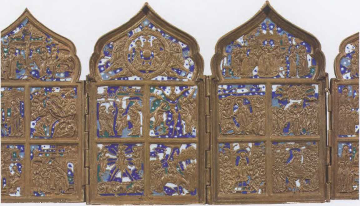 Столь же виртуозно, как и резьбой по кости, византийские мастера владели техниками перегородчатой и выемчатой эмали. Эмаль – это окрашенное различными окислами металлов стекло. Чтобы создать с его помощью узор, в материале (в Византии это почти всегда золото) делают выемки. Выемки создаются с помощью напаянной проволоки (перегородчатая эмаль) или вырезаются (выемчатая эмаль). В полученные углубления засыпают истолченную в порошок эмаль и обжигают в печи. Техника художественных эмалей достигает в Византии X–XI веков такого совершенства, такой чистоты красочных тонов и тонкости рисунка, которым нет равных в истории искусства. Из Византии эта техника приходит на Русь и в Грузию, распространяется, в несколько упрощенном виде, в Европе.