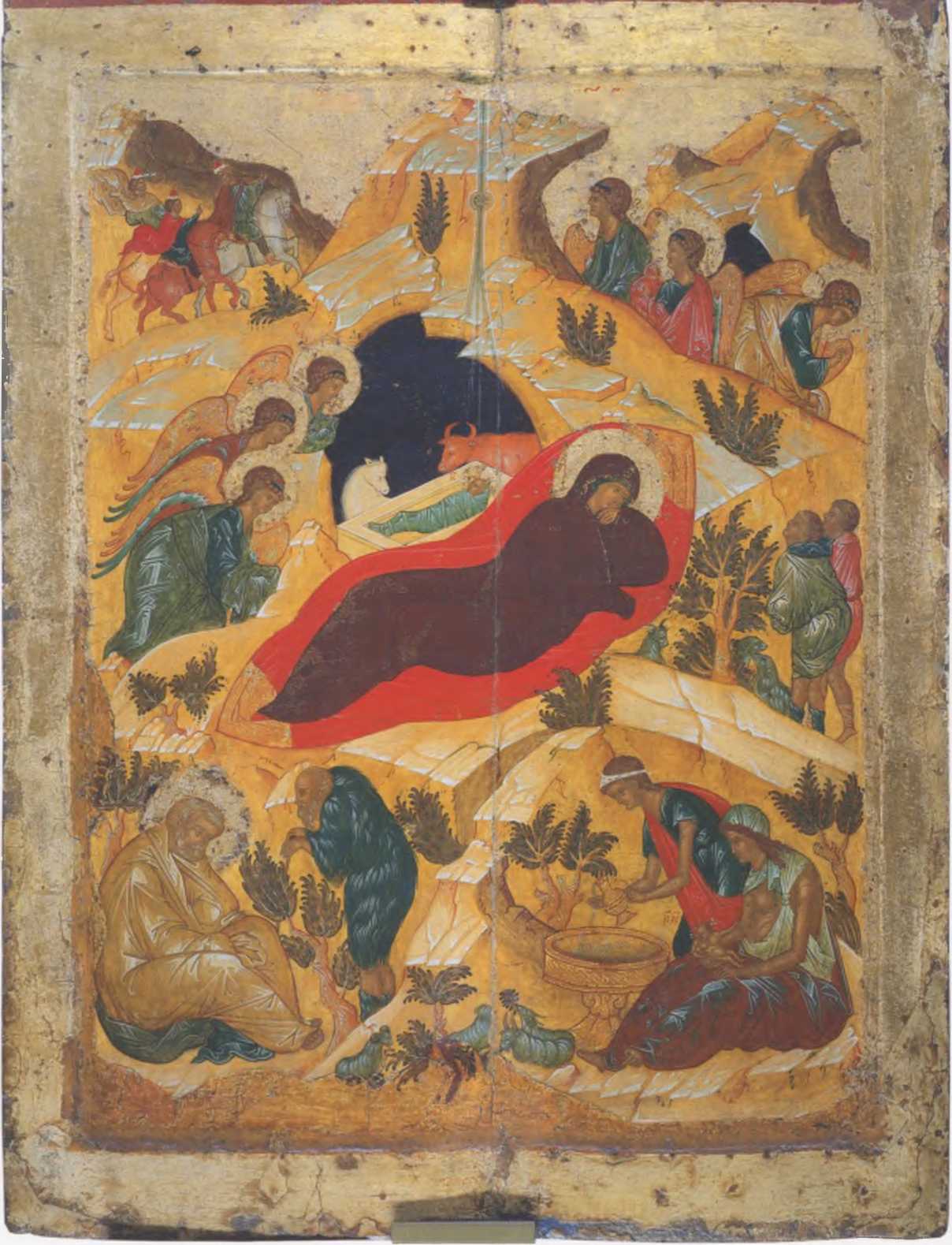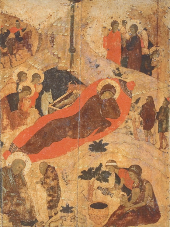 Рождество Христово сохранилось лучше других, хотя и с него полностью исчез золотой фон, опушь (красная полоска по краю иконы) и киноварные подписи; повреждены некоторые лики, отсутствует верхний, лессировочный слой живописи. Но, несмотря на все утраты, икона удивительно гармонична и красива. Аналогов ей нет: икона уникальна своей композицией. Конечно, похожие иконографические решения существовали. Но у греческих авторов XIV–XV веков мы видим многоголосые хоры ангелов, взмывающие в небо скалистые горы, динамичные фигуры людей. В новгородских и псковских иконах славословие Рождеству звучит в композиции и ритмическом строе произведений. Здесь же художник изобразил тишину, замерший, остановившийся мир.