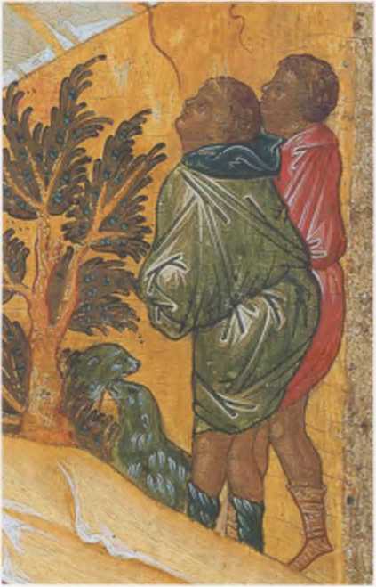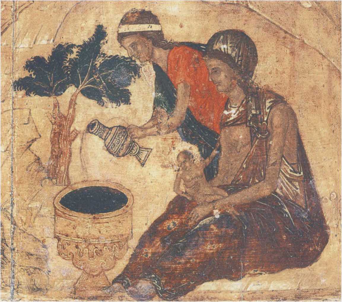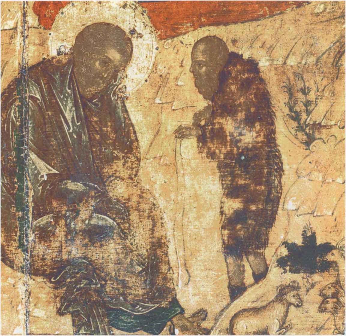Перед Иосифом стоит завернутый в милоть (плащ из шкуры овцы) старичок. Во многих искусствоведческих книгах можно прочитать, что этот старичок – «дух сомнения», который искушал Иосифа, заставляя не верить в Девственное Рождество. Но большинство современных исследователей отвергают подобную трактовку. Такая фигура встречается не только на русских, но и на византийских иконах. И у греческих авторов, писавших более реалистично, это, очевидно, изображение старого пастуха. Без сомнения, этот человек выглядит, как пастух, и на новгородской иконе из Третьяковской галереи, которую мы рассматривали, и на многих других. Иногда на этом месте мы видим не согбенного старика, а, напротив, молодого пастуха, который не вызывает никаких отрицательных ассоциаций. В предании не говорится о духах, зато есть упоминание об ангеле, который развевает сомнения Иосифа. «Сон Иосифа» мы видели, например, на Синайской иконе. Отрицательные персонажи в иконах изображаются крайне редко. Икона – это праздник веры, торжество света, провозглашение радости, образ райского состояния мира. А дух сомнения – это бес. Бесы же изображаются в иконах только поверженные (например, в иконе «Сошествие во ад»). Скорее всего, этот старичок – аллегория старости. По преданию, ко Христу пришли пастухи, представлявшие все человеческие возрасты – молодой, «средовек» и старец. Старший из них заводит беседу с Иосифом: простая и реалистичная деталь. Иногда он изображается беседующим с Саломией. Видно, что он окликает ее, заставляя обернуться, отвлечься от своего дела. Это бытовые подробности, которые подчеркивают, насколько далеки от понимания вселенского масштаба Рождества были люди, оказавшиеся у колыбели Спасителя.