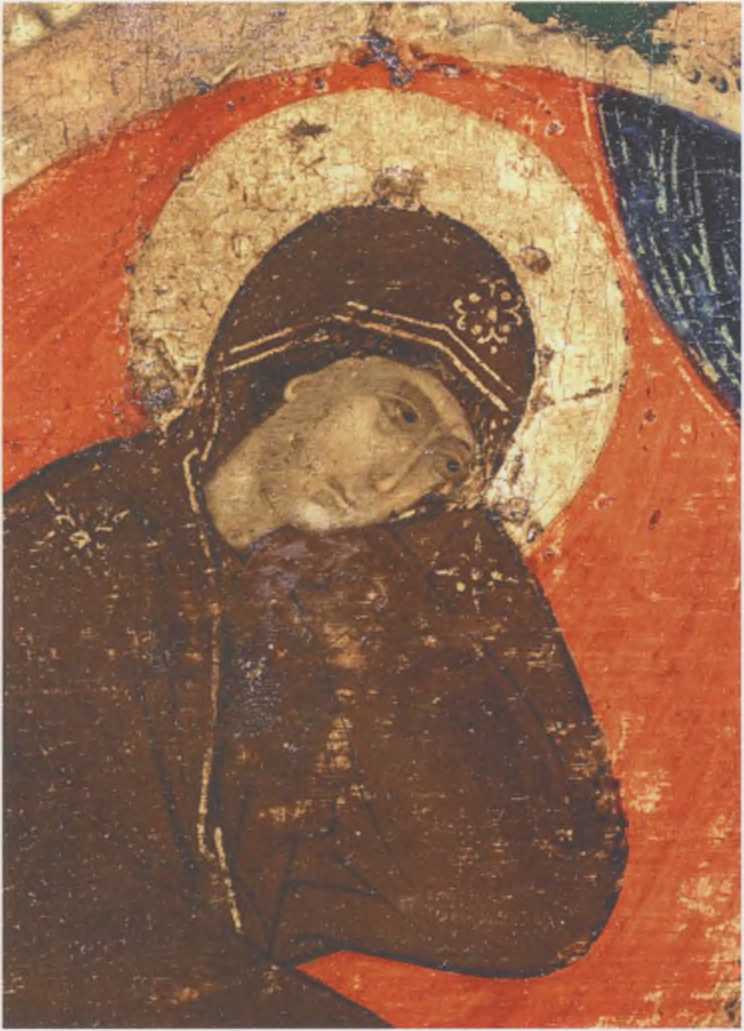 И над всем этим огромным миром, словно паря над ним, на царственном красном ложе лежит Богородица. Если посмотреть внимательней, мы увидим, что фигурка Младенца Христа точно повторяет контуры тела Богородицы. Он изображен так, словно только что отделился от Ее лона, и даже еще не лег до конца в ковчег яслей. Мы буквально видим, как Господь берет начаток природы от Матери. Как и на всех иконах Рождества, ясли здесь похожи на гроб, а младенческие пелены – на погребальные: Господь рождается, чтобы быть принесенным в жертву.