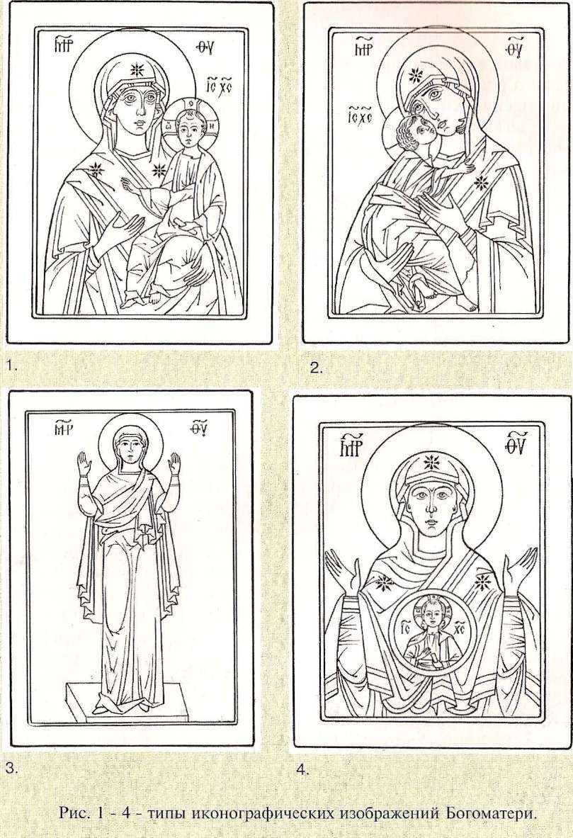 Особой любовью иконописцев пользовался образ Богоматери. Существует более двухсот типов иконографических изображений Бого матери, так называемых «изводов». Они имеют названия: Одигитрия, Елеуса, Оранта, Знамение и другие. Самым распространенным типом изображения является Одигитрия (Путеводительница), (рис. 1). Это поясное изображение Богоматери с Христом на руках. Они изображаются во фронтальном развороте, пристально глядящими на молящегося. Христос покоится на левой руке Марии, правую руку она держит перед грудью, как бы указывая ею на своего сына. В свою очередь, Христос правой рукой благословляет молящегося, а в левой руке он держит бумажный свиток. Иконы с изображением Богоматери принято называть по месту, где они впервые появились или где они особо были почитаемы. Например, широко известны иконы Владимирская, Смоленская, Иверская, Казанская, Грузинская и так далее.