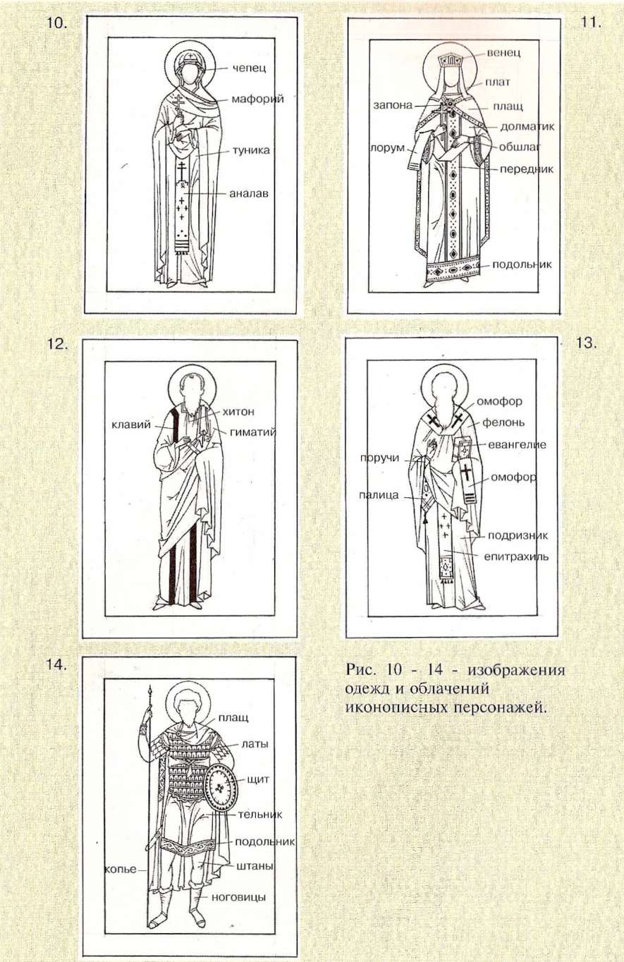 Интересны сведения о характере одежд и облачений, в которые одеваются персонажи икон. С точки зрения художественной, одежда иконописных персонажей весьма выразительна. Как правило, она строится на византийских мотивах. Каждый образ имеет одежду, характерную и присущую только ему. Так, одежда Богоматери – это мафорий, туника и чепец. Мафорий – покрывало, окутывает голову, плечи и спускается вниз до пола. Он имеет украшение в виде каймы. Темно-вишневый цвет мафория означает великий и царственный род. Мафорий одевается на тунику – длинное платье с рукавами и орнаментом на обшлагах («нарукавьях»). Туника окрашивается в темно-синий цвет, что символизирует целомудрие и небесную чистоту. Иногда Богоматерь предстает в одеждах не византийских императриц, а русских цариц XVII века.