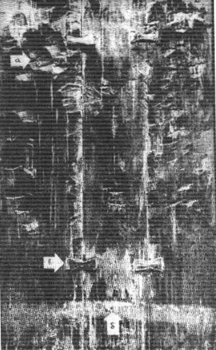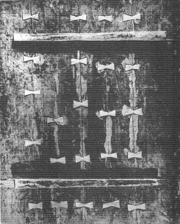 Тыльная сторона иконы. Конец XIII – начало XIVвв.: а) следы обработки доски топором; б) следы от накладных шпонок и гнезда от деревянных гвоздей; в) ласточки