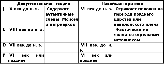 Таким образом, в научном мире существовало некое согласие о четырех основных источниках Пятикнижия (J, E, D, Р), написанных, большей частью, намного позднее 1000 г. до н. э., но которые, несмотря на свой возраст, позволяли заглянуть в историю Израиля между 2000 и 1300 гг. до н. э.