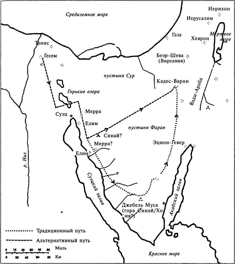 Если существует проблема определения даты исхода, то неудивительно, что похожие трудности возникают и при воссоздании пути следования израильтян из Египта. Если не считать ничтожного количества географических названий, рассказ проливает немного света на то, какой путь выбрали беженцы из Египта. Известно лишь, что они не пошли к Ханаану прямым путем. Кроме того, не существует единого мнения относительно достоверности и подлинности перечисленных географических названий. Хотя многие ученые считают, что путь, выбранный израильтянами, проходил по южной части Синайского полуострова, последние исследования подтверждают вероятность более северного направления (см. карту на с. 143).