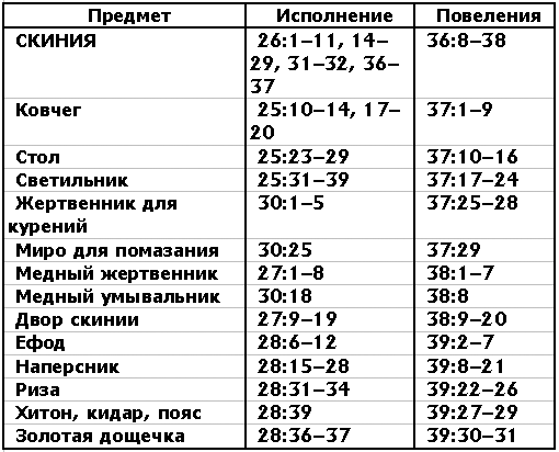 Большая часть этого раздела имеет сходство с предыдущими фрагментами Исхода. Мы находим здесь отчет об исполнении повелений, данных Богом Моисею во время его первого пребывания на Синае (25:1 – 31:18), почти дословно их повторяющий (см. таблицу). Сходство между повелениями и исполнением указывает на то, что народ повиновался Богу «в точности». Все было сделано именно так, как было приказано Моисею. Лишь изредка Божьи повеления (но не исполнение) содержат дополнительные указания, касающиеся использования какого–то определенного предмета (см., напр.: 30:6–10; 30:18–21).