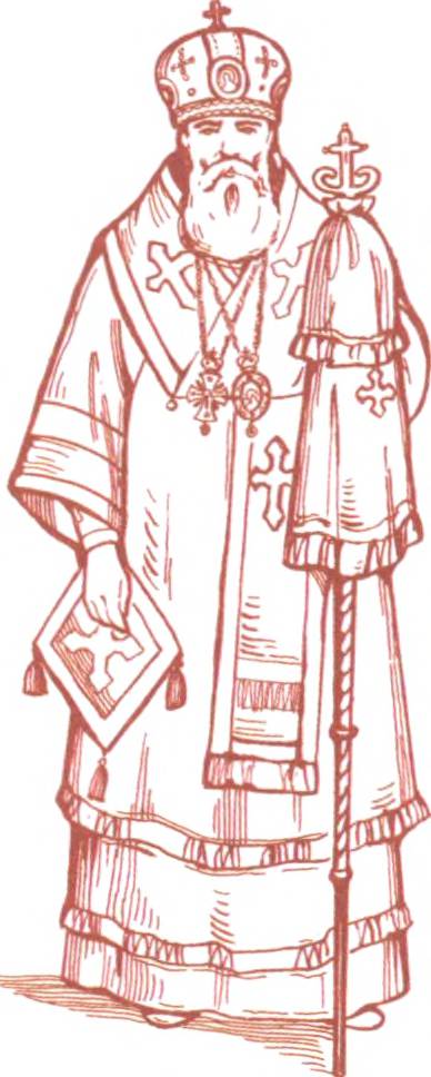 Облачение епископа: епископ облачается во все одежды священника, с небольшими различиями. Риза у него заменяется саккосом, набедренник – палицей, а митру епископ носит увенчанную крестом. Кроме этого, добавляется панагия и омофор.