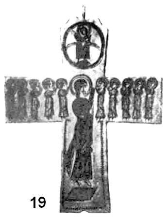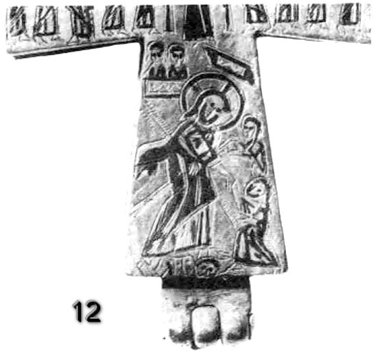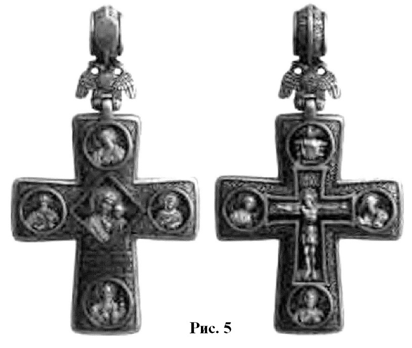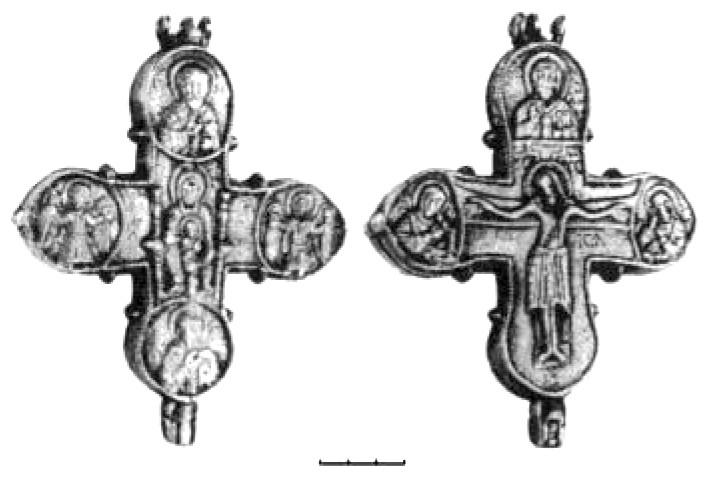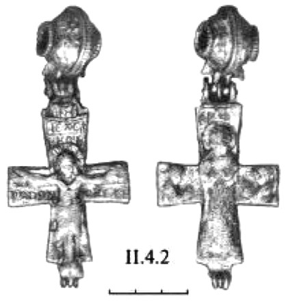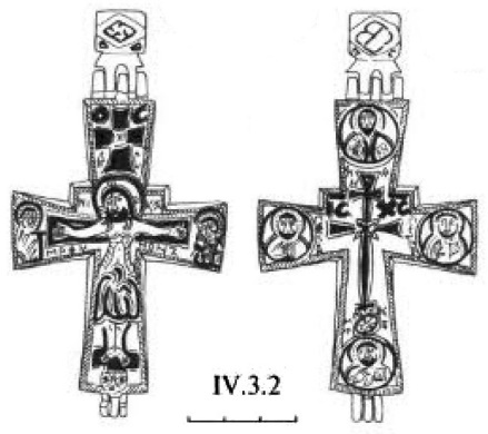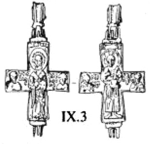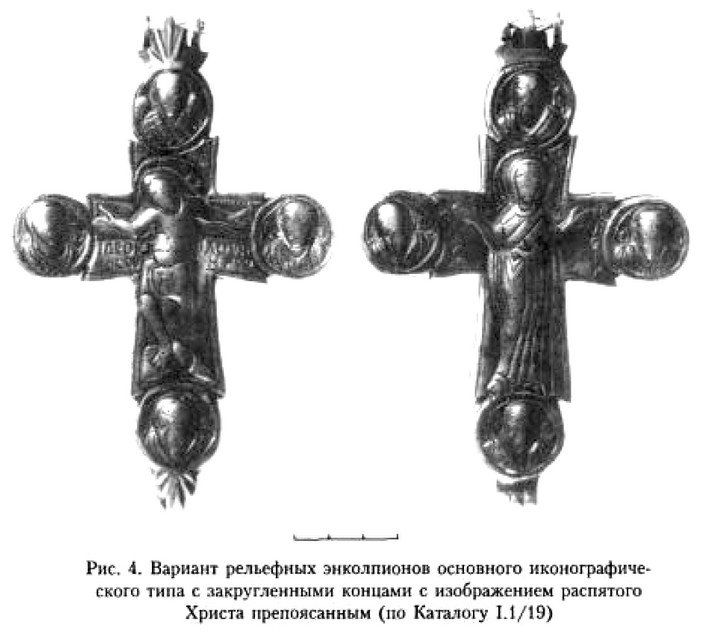 Интересно отметить, что эти две отчётливо читаемые линии развития в иконографии нательного креста нашли воплощение в своеобразном типе изделий, где их форма выполнена по образцу первой линии развития («латинская» модель с удлинённой нижней лопастью, резкое расширение лопастей от средокрестия и завершение их правильными окружностями), тогда как изображение на всей поверхности распятого Спасителя в длиннополой складчатой одежде, с переданными чертами лица и развёрнутыми кистями рук явно демонстрирует вторую линию развития (рис. 9). Существенным дополнением является размещение в круглых пальметках, увенчивающих оконечности креста, ликов апостолов216.