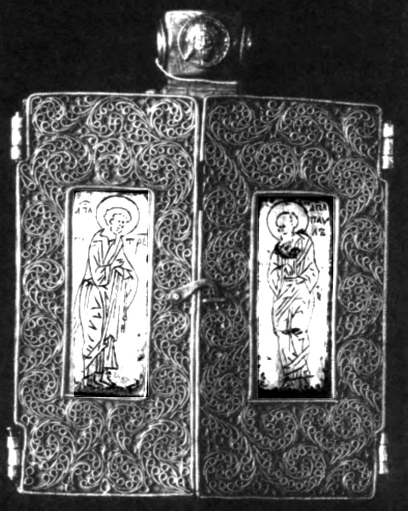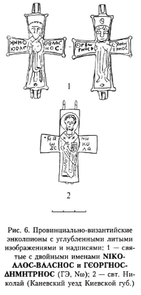 Полный инвентарь «миссионерского снаряжения», куда входят и два креста, приводится в сказочном Житии Панкратия Тавроменийского: «Апостол Пётр дал им весь церковный чин, две книги божественных таинств, два Евангелия, два Апостола, которые проповедовал блаженный апостол Павел, два серебряных дисконотира, два креста... и украшение церкви, то есть образ Господа нашего Иисуса Христа»195. О привнесении миссионерами нательных крестов свидетельствует их использование в дохристианских захоронениях, когда крестики носили в качестве украшений, вероятно, уже веря в их магическую силу196.