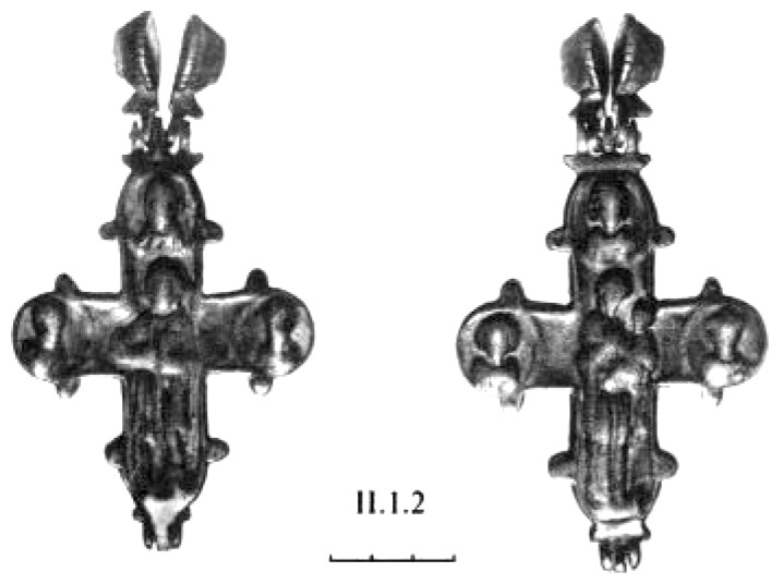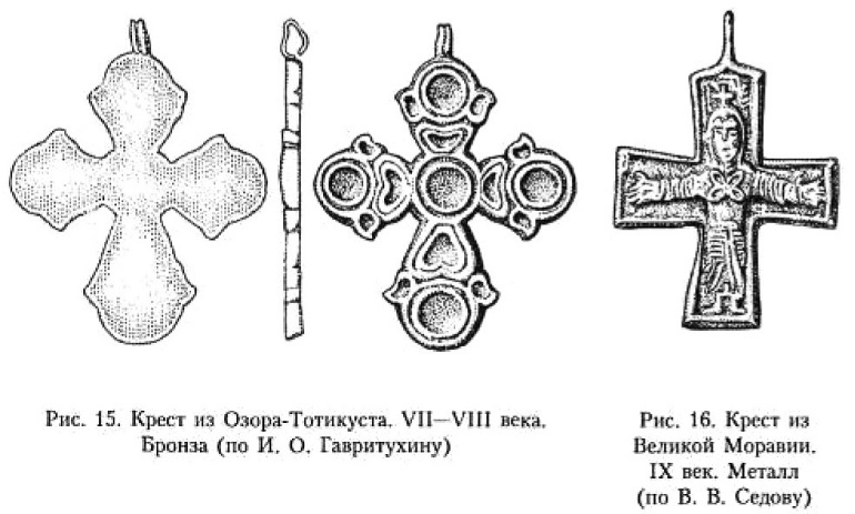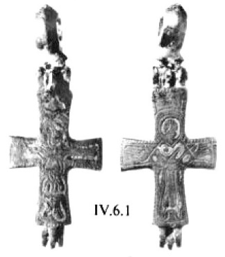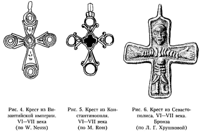 Появлению наиболее ранних крестов-тельников, по-видимому, предшествуют нашивные кресты, семантический смысл которых продолжает идею нанесения креста на тело. Находки этих предметов в археологических комплексах относятся к VI веку184.