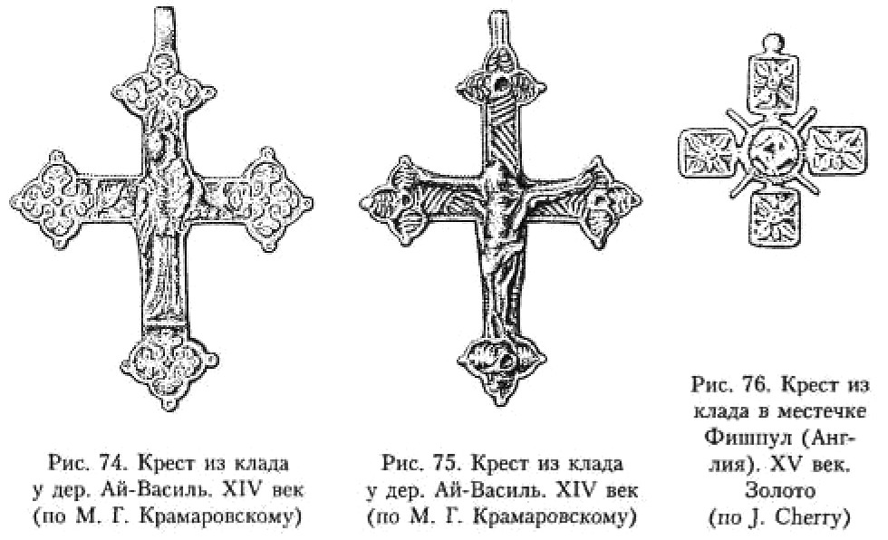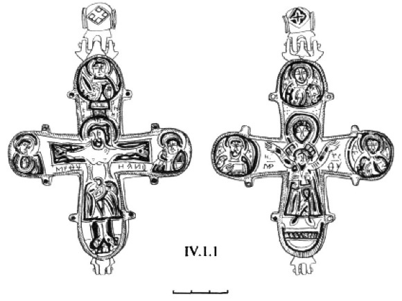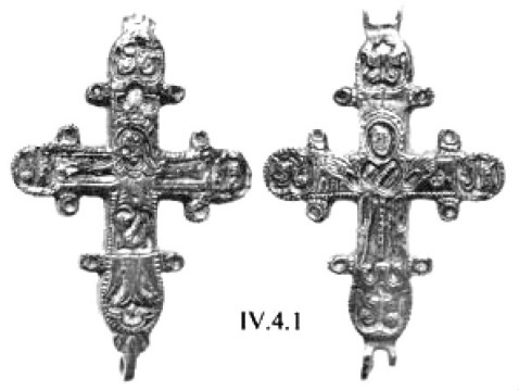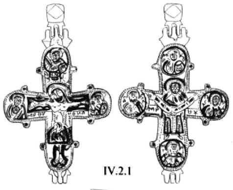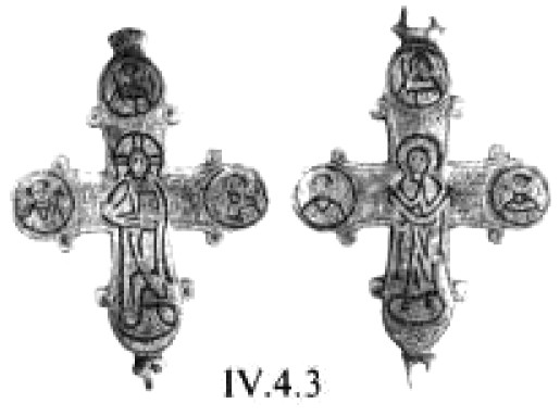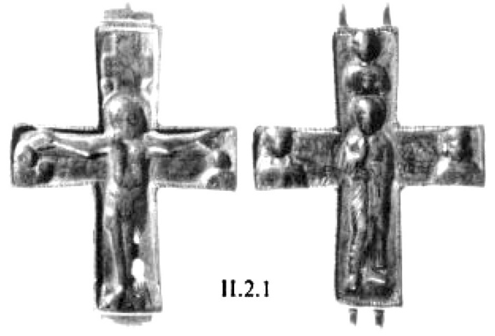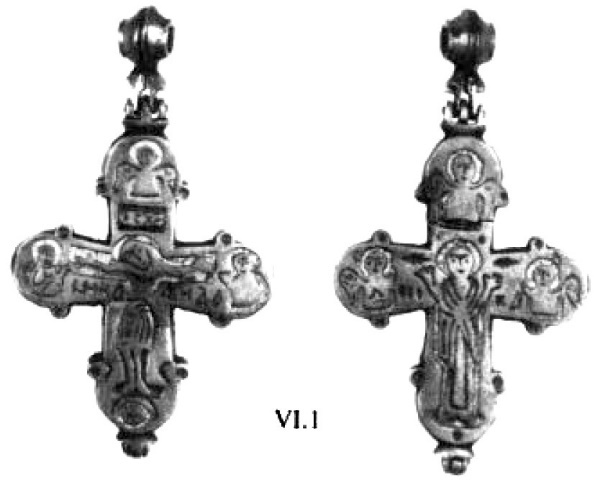 Появление наиболее ранних крестов-тельников, если ориентироваться на археологические датировки, относится, вероятно, к VI веку, Л. Г. Хрушкова сообщает о находках двух золотых крестиков из цитадели в Истрии201. К VI–VII векам относится крест из Аксиополиса в Румынии202. Подобные изделия находят в восточных районах бывшей империи между Турцией и Кипром, где они бытуют вплоть до VII века203.