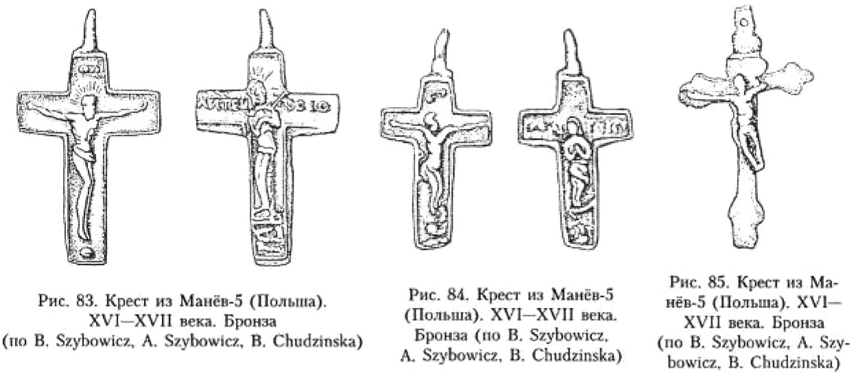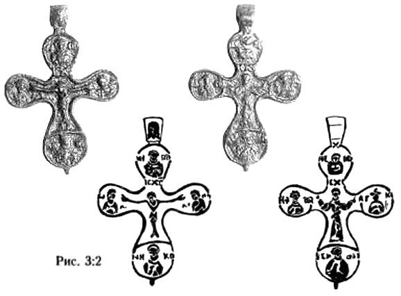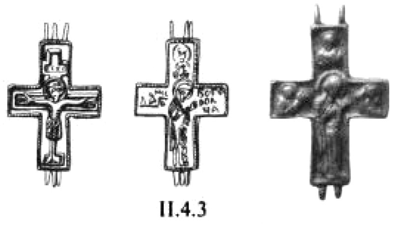 К этому времени следует относить появление на восточнославянских территориях металлических крестиков с так называемым грубым изображением распятого Христа237 (рис. 16). «Высота характеризуемых крестов, – пишет по этому поводу В. В. Седов, – всегда несколько больше их ширины. Лопасти их слегка расширяются. На лицевой стороне крестов имеется рельефное изображение распятого Христа, одетого в длинный хитон, на груди крестовидная перевязь. Грубо, но отчётливо переданы кисти рук, они несколько преувеличены, пальцы раздвинуты, на запястьях во многих случаях имеется спиралевидный орнамент»238.