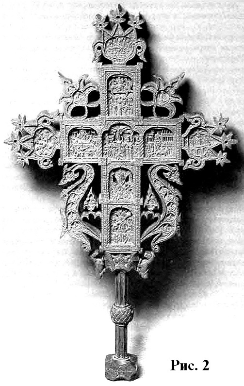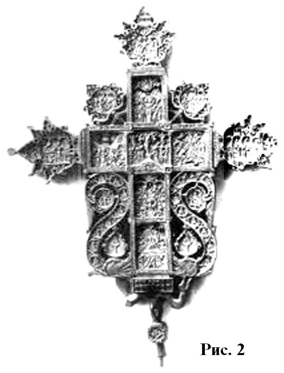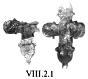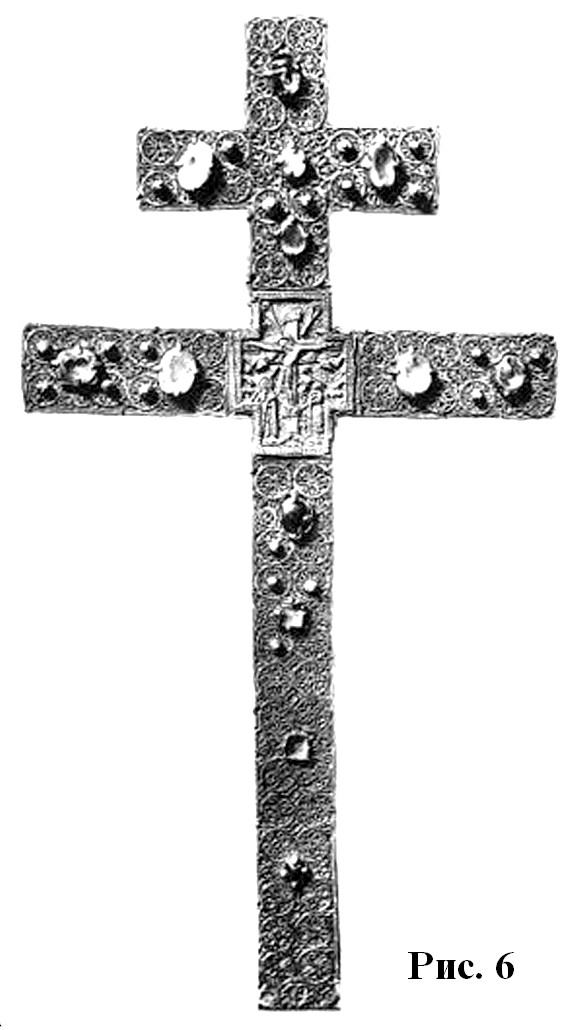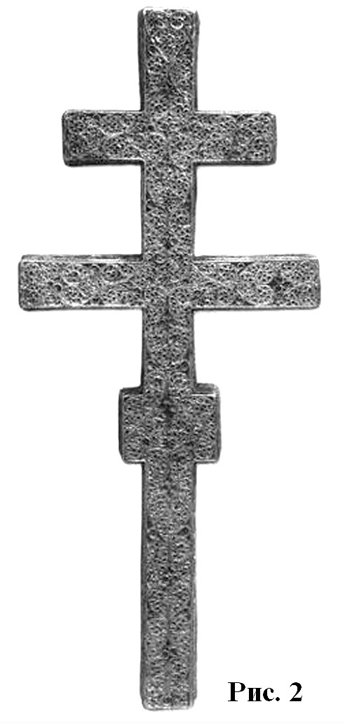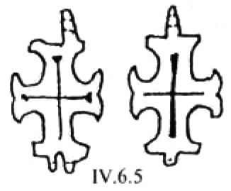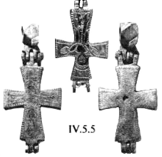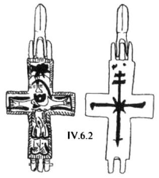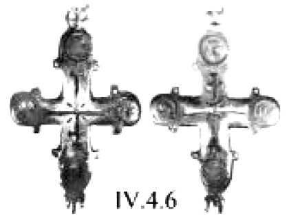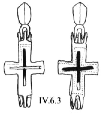 Эта попытка особо подчеркнуть средокрестие креста, по существу, впервые, проявляется на серебряном изделии из Йоханистусa302. Его вертикальные лопасти несколько длиннее горизонтальных (рис. 59). Лопасти креста плавно расширяются от средокрестию. Крест по периметру оконтурен рубчатым кантом. Углы средокρестия, как и его центр, выделены рельефными окружностями. Аналогично оформлена и оборотная сторона креста.