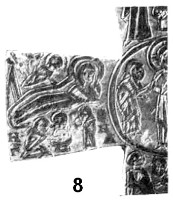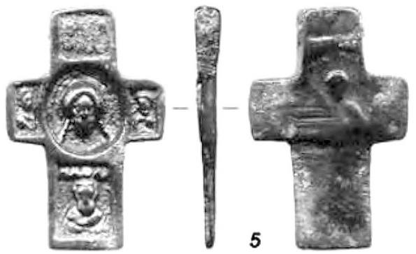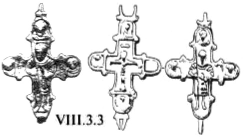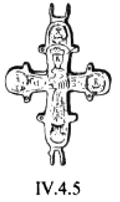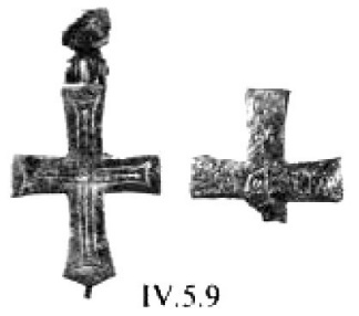 В «абсолютно тождественной манере выполнен бронзовый нательный крестик из Смирны (Турция)215 (рис. 8). Его лопасти почти равновелики (кроме верхней вертикальной). Они слегка расширяются к средокрестию и закруглены. По периметру крестик оконтурен рельефным валиком. Всю площадь его занимает фигура распятого Спасителя. Она передана достаточно реалистично. Особое внимание мастер уделил изображению лица, развёрнутых кистей рук и складчатой длиннополой одежды. Под оглавием, над головой Спасителя, помещён четырёхконечный «греческий» крест.