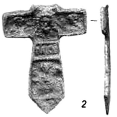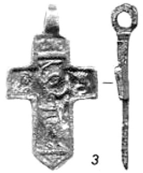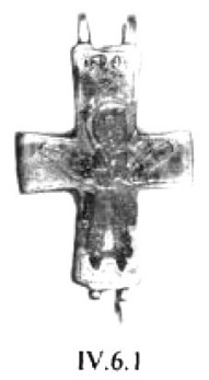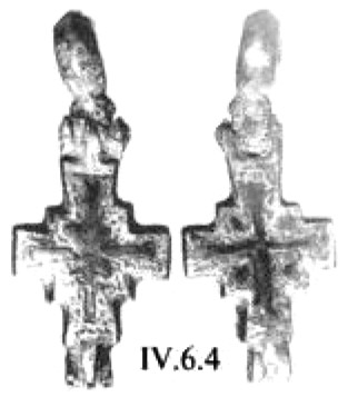 Оригинален другой, свинцовый, нательный крестик, найденный у базилики в Микульчице241 (рис. 19). Пропорции его аналогичны описанным выше образцам (схема «греческого» креста со слегка укороченными по отношению к вертикальным горизонтальным лучам). По периметру крестик оконтурен рельефным валиком. Абсолютно всё свободное пространство креста занимает фигура Иисуса, переданная в предельно условной манере. Наиболее реалистично показано лицо и ладони Спасителя. Особое внимание мастер уделил одежде. Это опять-таки длинная, до пят, туника, орнаментированная в нижней части.