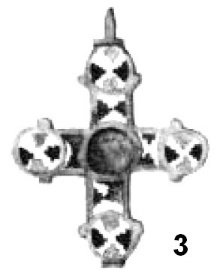К наиболее простым относится крестик из Вэстернготланда261 (рис. 27). Он построен по модели «греческого» креста, однако лопасти его выполнены небрежно и различны по величине. Наиболее велика верхняя вертикальная лопасть. Это сделано специально для изготовления отверстия для подвешивания крестика. Изделие отнесено Й. Стаекером к типу 1.1.2 по его классификации262. Картографирование подобных предметов показало их наибольшее сосредоточение в Скандинавии и на юге Европы, в Адриатике263.