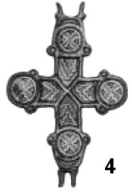Как можно будет убедиться ниже, эта линия развития находит дальнейшее продолжение. Яркой иллюстрацией является крест из Византийской империи210 датируемый VI–VII веками (рис. 4). Форма креста построена по модели «латинского», когда нижняя перекладина является самой длинной. Лопасти креста резко расширяются от средокрестия. Их оконечности увенчаны правильными окружностями, в которые, в свою очередь, вписаны концентрические круги. Аналогичным способом оформлено средокрестие. Верхняя вертикальная лопасть увенчана дужкой для подвешивания изделия.