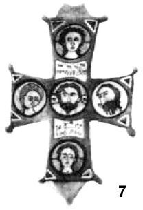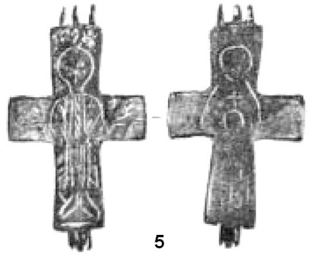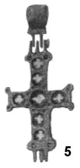 По-видимому, такие нательные крестики были достаточно характерны для Византии VI–VII веков. Дополнительным свидетельством этого является нательный крестик из Константинополя211 (рис. 5). Выполнен по принципу «латинского» креста, когда самой длинной является нижняя вертикальная перекладина. Лопасти оформлены в виде фигурных пальметок, увенчанных круглыми медальонами. Средокрестие показано в виде «греческого» креста, покрытого эмалью. Также фигурно оформлено и оглавие.