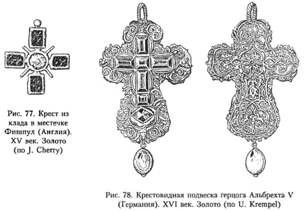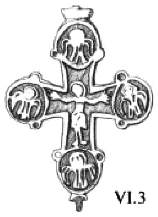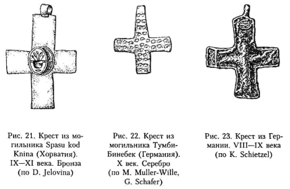 Наиболее ранние кресты-тельники, известные в Европе, относятся к VI–VIII векам. Наличие специальных отверстий или лужек для ношения изделий на шее отличает их от крестовидных фибул197, нашивных крестов198, энколпионов199 и других христианских оберегов, встречающихся в комплексах ещё конца VI и даже до IX века включительно200.
