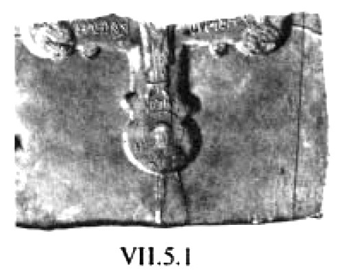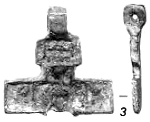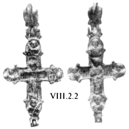 К VII–VIII векам относится бронзовый нательный крест из погребения Озора-Тотикуста «II среднеаварского периода»230 (рис. 15). Крест выполнен по модели «латинского». Лопасти его резко расширяются от средокрестия и увенчаны окружностями, дополнительно оконтуренными парными пальметками. Средокрестие креста оформлено в виде такой же окружности. В центр креста как бы вписан ещё один крестик с лопастями в виде «сердцевидных» пальметок. Налицо отмеченная выше традиция, уходящая корнями в VI век (рис. 4, 5).
