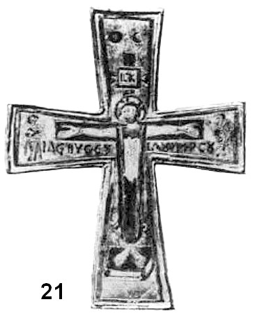 Продолжение традиции, когда крест-тельник изготовлялся предельно лаконично, имеет место с IX по XI век. Яркое подтверждение этому мы находили в Южной Европе, в частности в Хорватии, куда христианство проникает со второй трети VII века. Принято считать, что до конца IX века христианство распространяется в сербских и хорватских землях, с конца же IX до начала XII века характерно упрочнение его позиций242. В Хорватии, в могильнике Spasu kod Кnіnа, надёжно датированном этим временем, обнаружены тельники, вырезанные из бронзового листа243 (рис, 20, 21). Первое изделие вообще не имеет каких-либо изображений (рис. 20). Горизонтальная лопасть несколько короче вертикальной и расположена таким образом, что верхняя вертикальная лопасть, в которой проделано сквозное отверстие и вставлена бронзовая проволока для продевания шнурка, наиболее увеличена. Такая форма креста построена по модели «креста Петра», распятого головой вниз244.