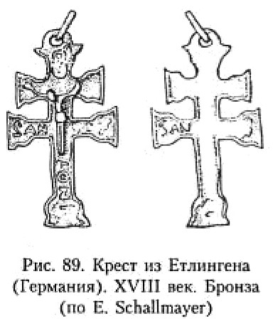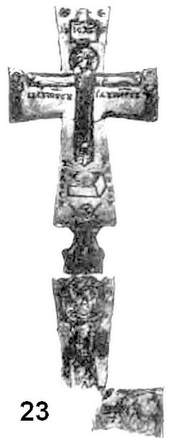 К VIII началу IX века относится нательный крест из Германии; точное место находки не указано, не указан и материал, из которого он изготовлен248 (рис. 23). Суля по фотографии, это либо сильно корродированная бронза, либо железо. Изделие выполнено по типу «греческого» креста. Лицевая сторона оконтурена по периметру тонким, рельефным валиком. Практически всю площадь занимает предельно схематично выполненная фигура распятого Иисуса. В оглавии креста отлиты горизонтальные. плохо проработанные полоски, – вероятно, мастер пытался изобразить доску с надписью. На правой горизонтальной лопасти креста вертикальным валиком особо обозначена пустая прямоугольная площадка. Может быть, уместно напомнить читателю, что в таких, порой особо отведённых, зонах на православных крестах-тельниках наносились заглавные буквы имени Христа249. Вполне вероятно, что в данном случае перед нами какие-то следы проявления именно этой традиции.