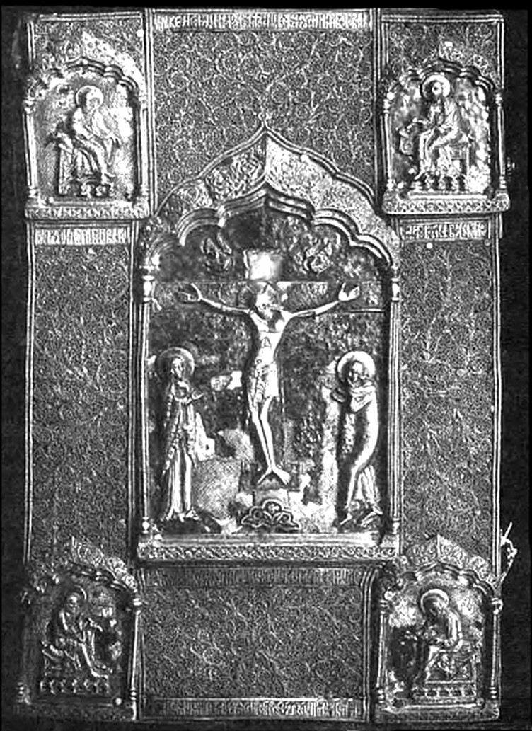 Оклад напрестольного Евангелия тетр., датированный по клейму 1723 годом. Выставка «Россия. Православие. Культура». ГИМ. Ноябрь 2000 – февраль 2001 года. Кат. № 592. Серебро, позолота, чеканка, резьба. Размер 56×39 см. Поступило из Донского монастыря при ликвидации Антирелигиозного музея.