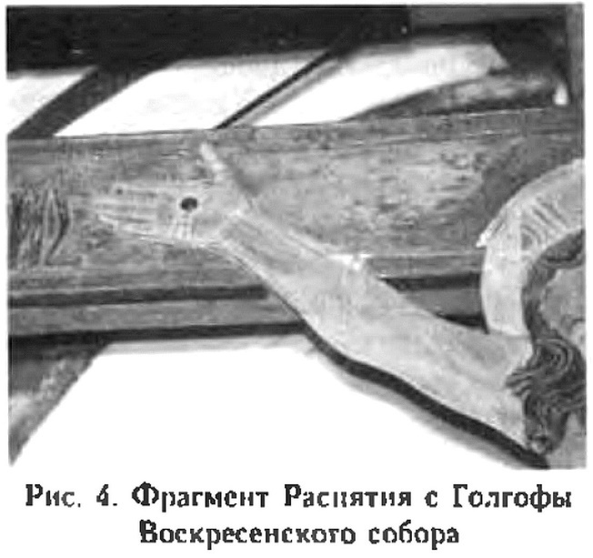 Викторов А. Описание записных книг... В 1701 и в 1720 годах упоминаются резные кипарисные Распятия в церкви Воскресения Христова за престолом, на Голгофе и Гроб Господень. Указ. соч. С. 600–601. Соколова И. М. Русская деревянная скульптура XV–ХVIII веков. Каталог. М., 2003. № 26, 27, 28.