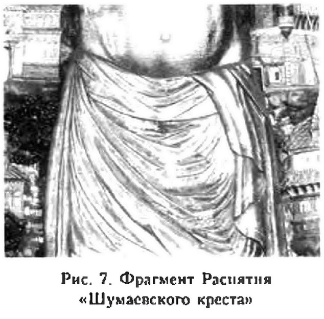 Ещё один крестик этого же типа из Лунда279 отличается оригинально выполненной фигурой Спасителя (рис. 38), у которого особенно тщательно проработаны детали длиннополой одежды и длинные, загнутые вверх усы.