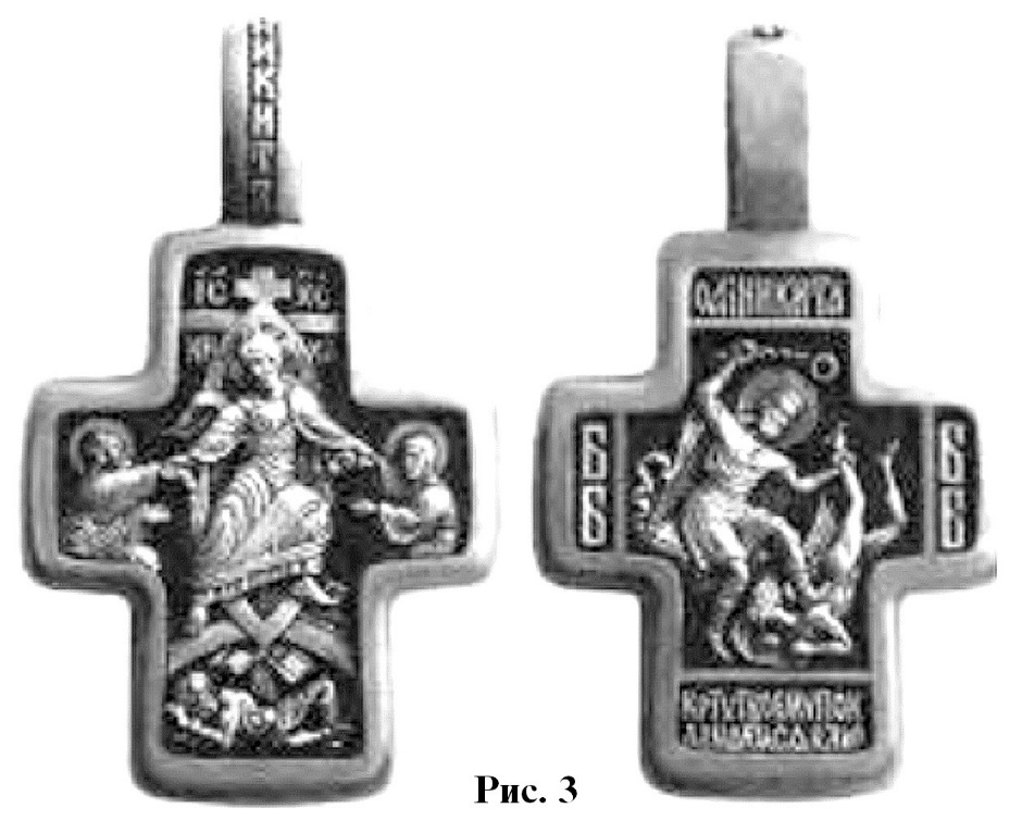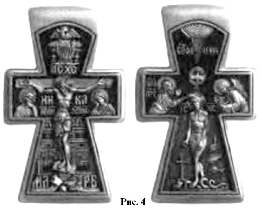 Среди изображений символа, призванного выполнять различные функции в христианской обрядовой практике (крест напрестольный, крест наперсный, крест кабинетный и др.), особое место занимает нательный крест. Появление этого символа, по-видимому, объясняется охранительной функцией креста, о чём свидетельствует традиция, связанная с обычаем древних христиан изображать малые кресты на членах своего тела и преимущественно на челе181. По мнению А. П. Голубцова, «возложением креста на челе христиане свидетельствовали своё исповедание, свою веру в Распятого...»182. Хотя в христианстве необходимость терпеливого перенесения жизненных тягот связана с идеей несения креста, думается, не следует исключать и буквального понимания изречения из Нового Завета: «Кто хочет идти за Мною, отвергнись себя, и возьми крест свой, и следуй за Мной»183 (Мф. 16:24).