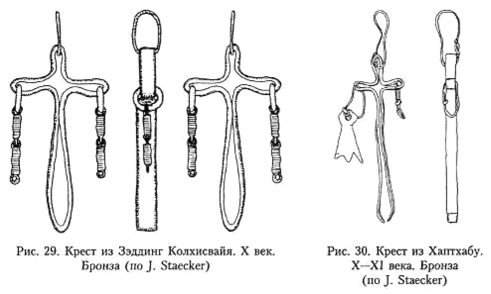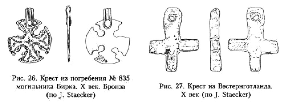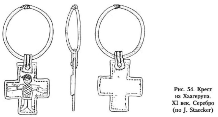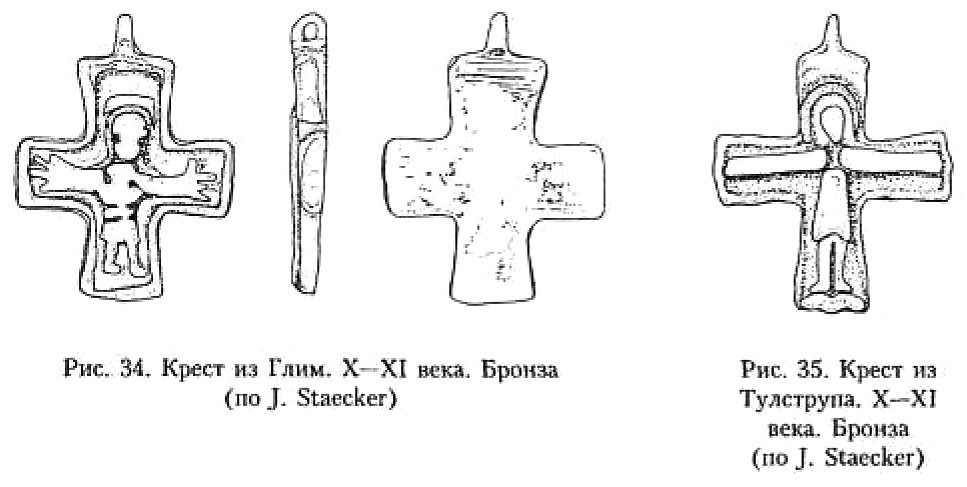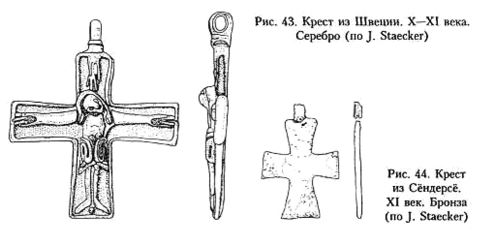 В монографии Й. Стаекера, посвящённой типам изображений крестов и крестов с Распятием времени викингов миссии в Старой Дании и Швеции186, детально анализируются кресты-тельники и энколпионы, обнаруженные преимущественно в означенной части Скандинавии, с привлечением известных автору аналогий уже практически со всей территории распространения христианства. Данные исследования имеют для нас огромную ценность прежде всего по причине введения в научный оборот значительного корпуса источников, ранее мало известных российскому читателю. Небезынтересна и типологическая разработка, предлагаемая Й. Стаекером, так же как и хорошо обоснованные хронологические привязки изделий.